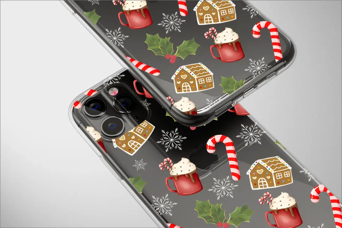 Embrace the holiday spirit with this charming Christmas pattern. This delightful design features a cheerful collage of classic winter treats, including detailed gingerbread houses, mugs of hot cocoa topped with cream, and sweet candy canes. Whimsical snowflakes and sprigs of holly are scattered throughout, creating a cozy and joyful scene perfect for celebrating the season.