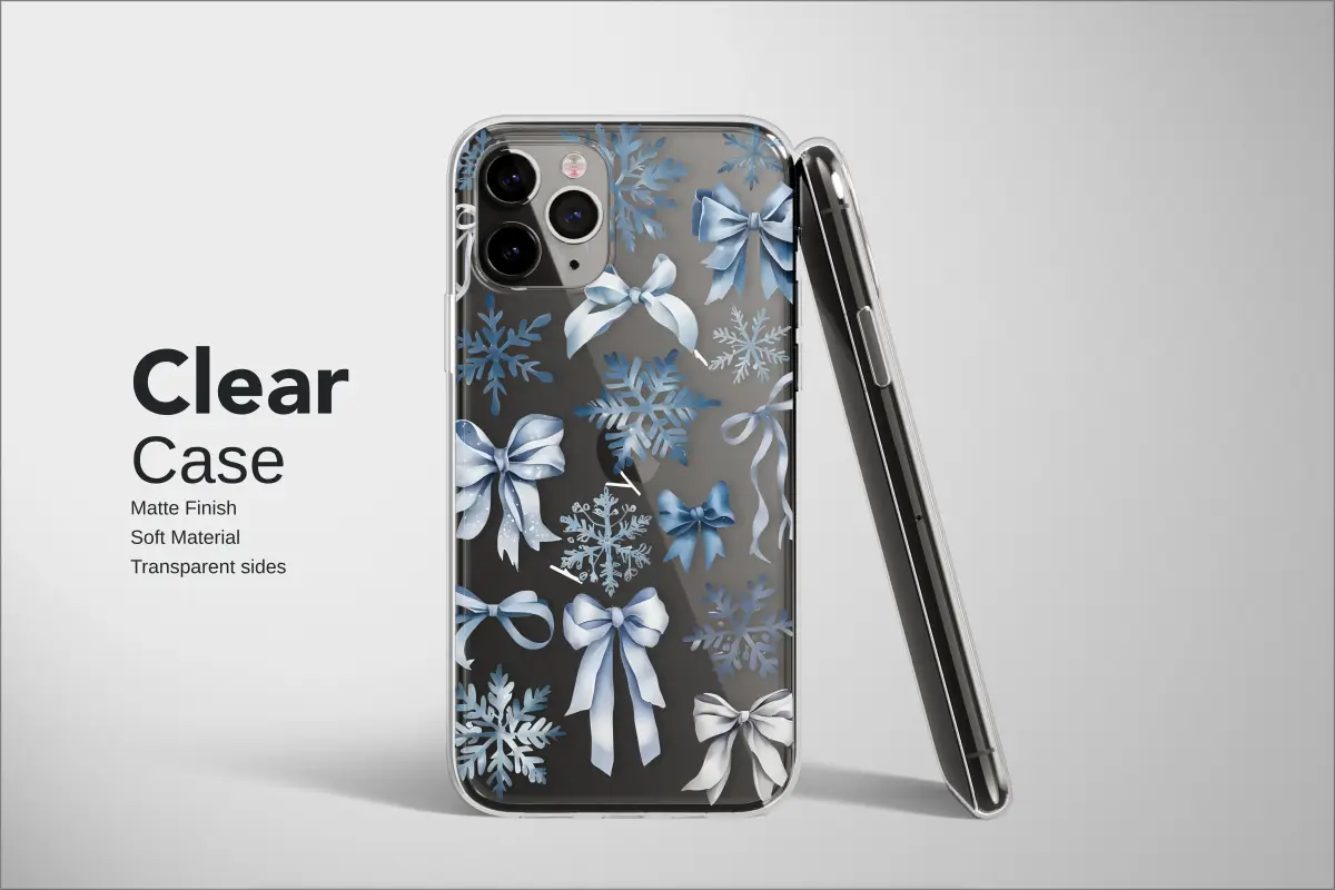 Capture the essence of a winter wonderland with this elegant design. The pattern features a beautiful arrangement of detailed, icy blue snowflakes paired with soft, silky ribbon bows in coordinating shades of silver and blue. This creates a festive and charming aesthetic, perfect for the holiday season or for anyone who appreciates a touch of whimsical winter magic.