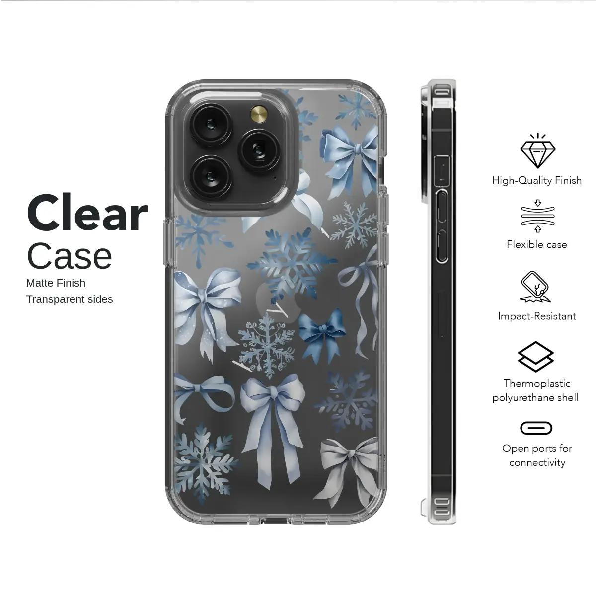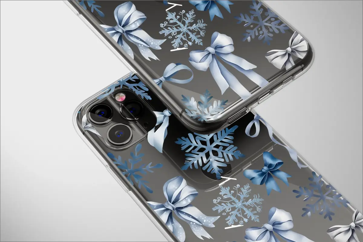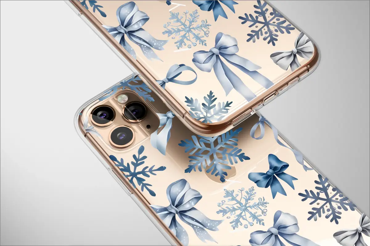 Capture the essence of a winter wonderland with this elegant design. The pattern features a beautiful arrangement of detailed, icy blue snowflakes paired with soft, silky ribbon bows in coordinating shades of silver and blue. This creates a festive and charming aesthetic, perfect for the holiday season or for anyone who appreciates a touch of whimsical winter magic.