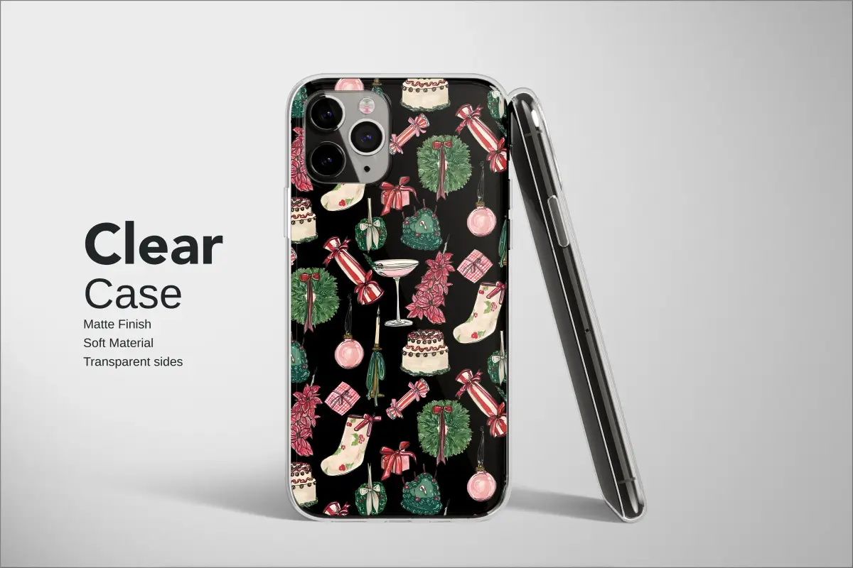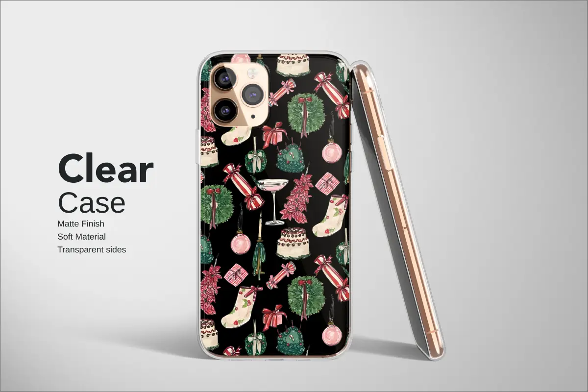 Embrace the holiday spirit with a unique twist. This festive design features a vibrant collage of classic Christmas illustrations, including charming stockings, elegant wreaths, sweet cakes, and celebratory cocktails. Rendered in a whimsical, hand-drawn style, these nostalgic elements pop against a modern, colorful glitch art background, creating a bold and cheerful pattern perfect for the season.