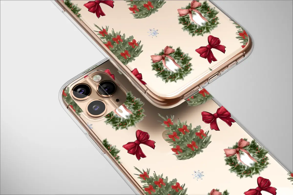 Embrace the holiday season with a unique twist. This festive design features beautifully illustrated Christmas trees and wreaths, complete with charming red bows and twinkling lights. The classic holiday elements are juxtaposed against a modern, abstract glitch art background, creating a vibrant and eye-catching pattern that adds a touch of contemporary style to your festivities.