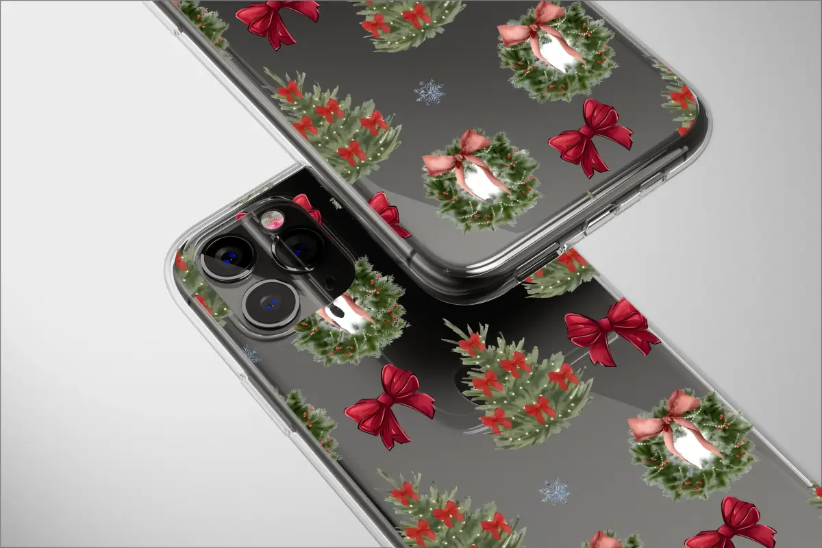 Embrace the holiday season with a unique twist. This festive design features beautifully illustrated Christmas trees and wreaths, complete with charming red bows and twinkling lights. The classic holiday elements are juxtaposed against a modern, abstract glitch art background, creating a vibrant and eye-catching pattern that adds a touch of contemporary style to your festivities.