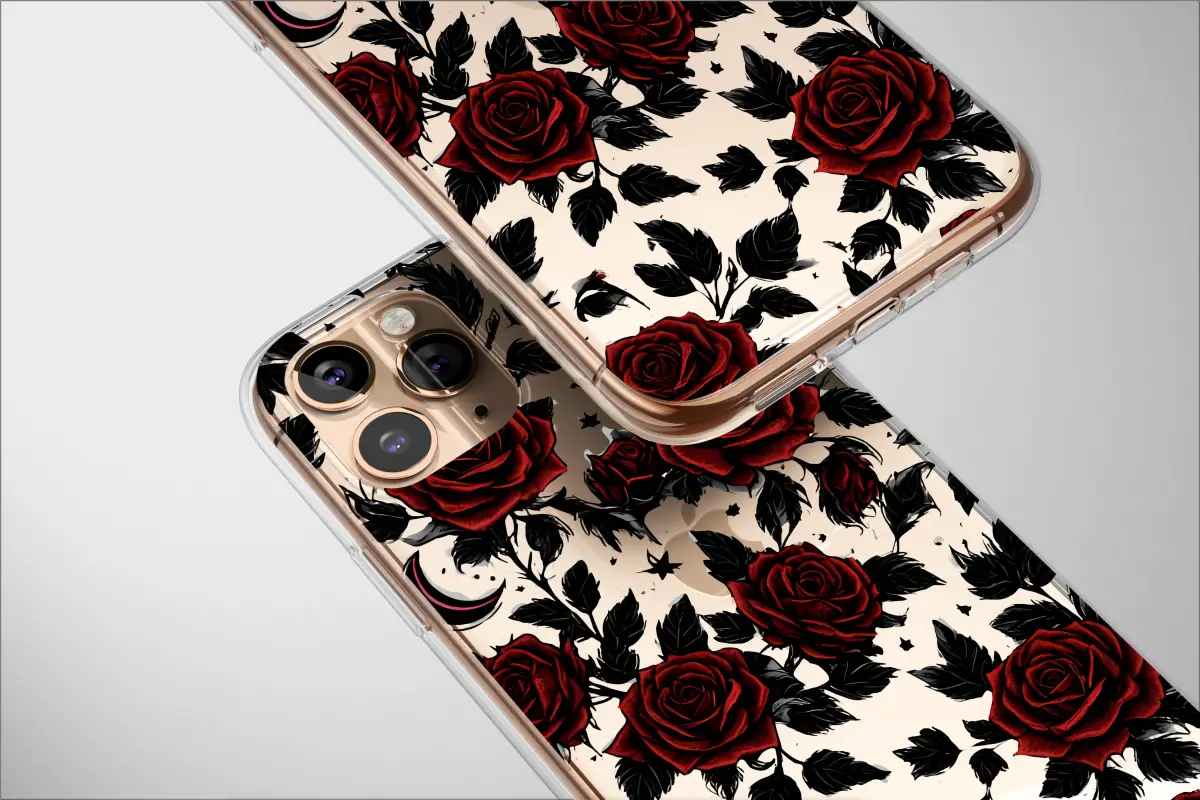 Embrace a dark, romantic aesthetic with this stunning gothic floral design. This moody pattern features intricately detailed deep red roses set against a backdrop of black leaves and a dark background. Tiny, whimsical crescent moons are scattered throughout, adding a touch of celestial and witchy charm to the overall composition.