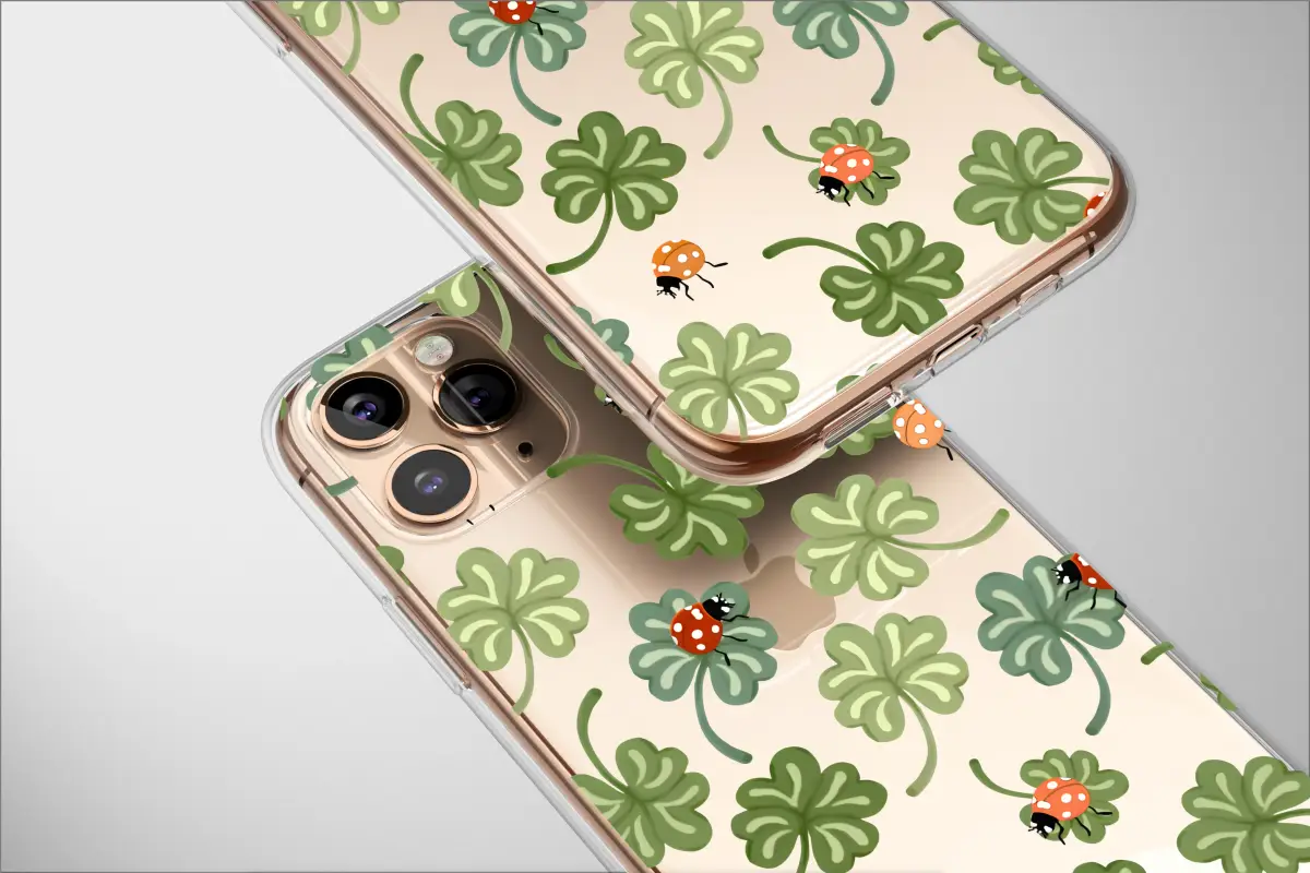 Bring a touch of luck wherever you go with this charming ladybug and four-leaf clover design. This whimsical pattern features illustrated green shamrocks and bright red ladybugs scattered across a clean background, creating a playful and cheerful aesthetic perfect for nature lovers or anyone celebrating St. Patrick's Day.