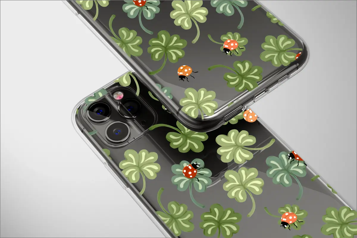 Bring a touch of luck wherever you go with this charming ladybug and four-leaf clover design. This whimsical pattern features illustrated green shamrocks and bright red ladybugs scattered across a clean background, creating a playful and cheerful aesthetic perfect for nature lovers or anyone celebrating St. Patrick's Day.