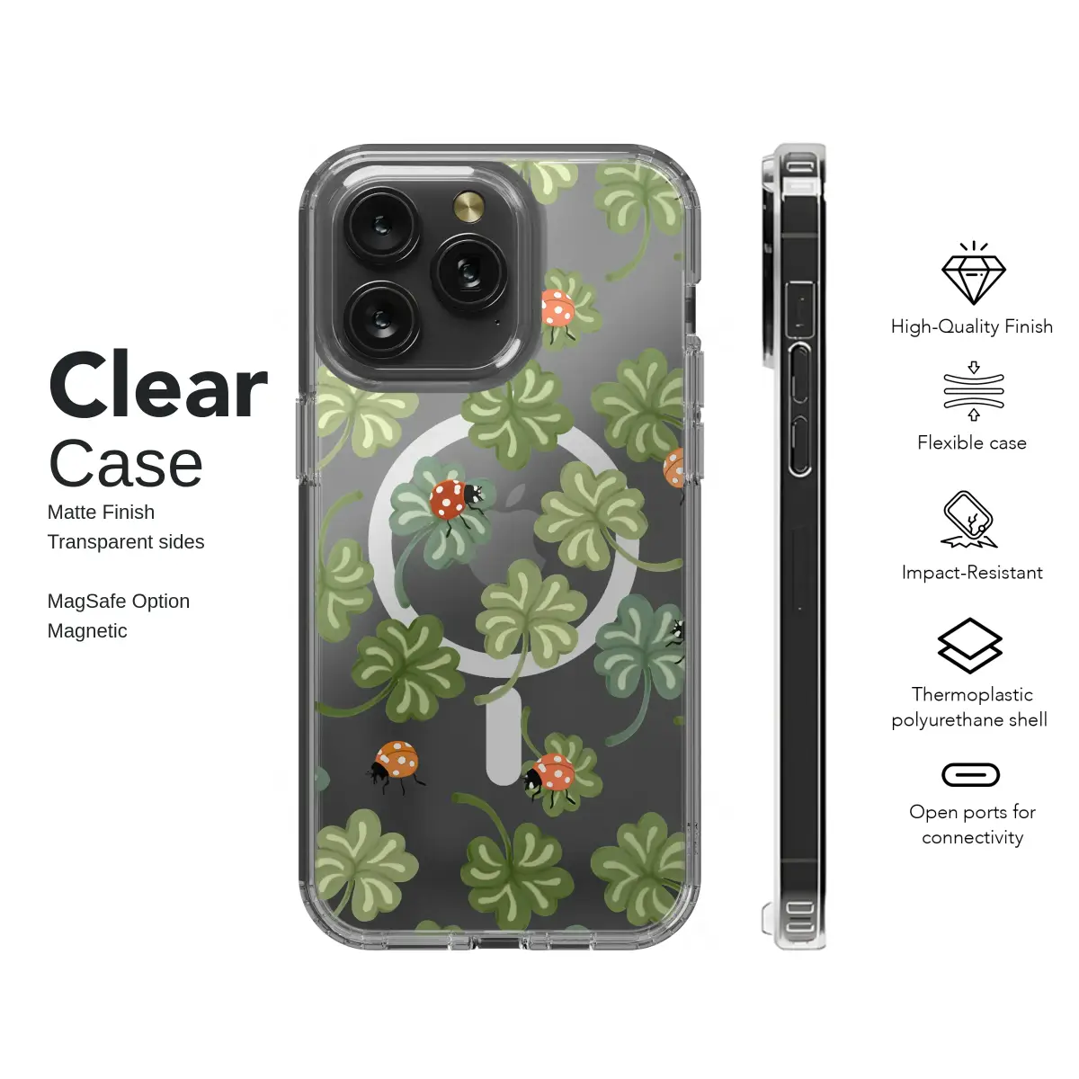 Bring a touch of luck wherever you go with this charming ladybug and four-leaf clover design. This whimsical pattern features illustrated green shamrocks and bright red ladybugs scattered across a clean background, creating a playful and cheerful aesthetic perfect for nature lovers or anyone celebrating St. Patrick's Day.