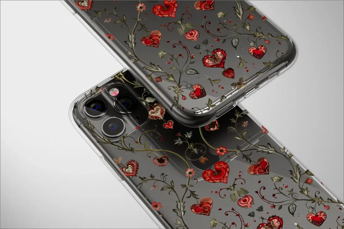 Embrace a dark romantic aesthetic with this intricate gothic heart and vine pattern. The design features a lavish, repeating pattern of ornate hearts, reminiscent of Victorian damask wallpaper. Intricate, metallic-sheened vines weave through the composition, adorned with delicate leaves and subtle red floral blossoms against a deep black background. Each heart is uniquely detailed, evoking a sense of antique charm and gothic elegance.