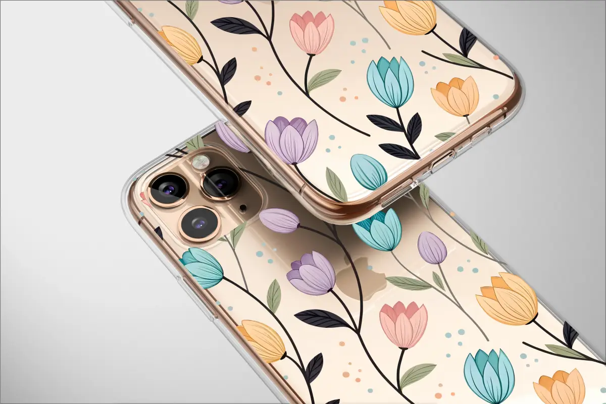 Embrace a unique blend of nature and digital art with this captivating pastel glitch floral design. Delicate, stylized tulips in soft shades of pink, purple, teal, and yellow bloom against a dramatic black background, creating a striking contrast. The whimsical botanical aesthetic is enhanced by a subtle digital glitch effect, adding an unexpected, contemporary twist to the dark floral pattern.