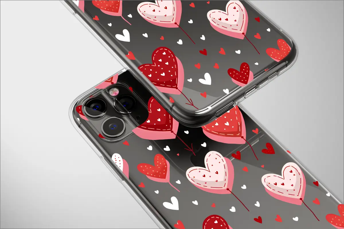 Showcase your romantic side with this delightful heart balloon design. The pattern features a charming collection of red and pink heart-shaped balloons, detailed with delicate stitching and tiny white hearts. This whimsical scene is set against a modern, abstract background with a pixelated or glitch art effect, creating a unique and eye-catching look that beautifully blends classic romance with contemporary style.