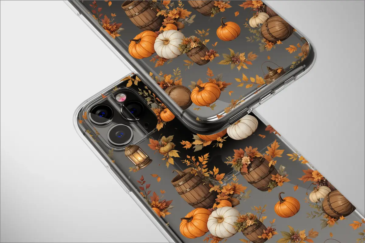 Embrace the cozy spirit of the season with this rustic autumn pattern. This charming design showcases a beautiful arrangement of orange and white pumpkins, vintage wooden barrels, and warm lanterns. Sprinkled throughout are vibrant fall leaves, creating a picturesque harvest scene perfect for celebrating the fall aesthetic.