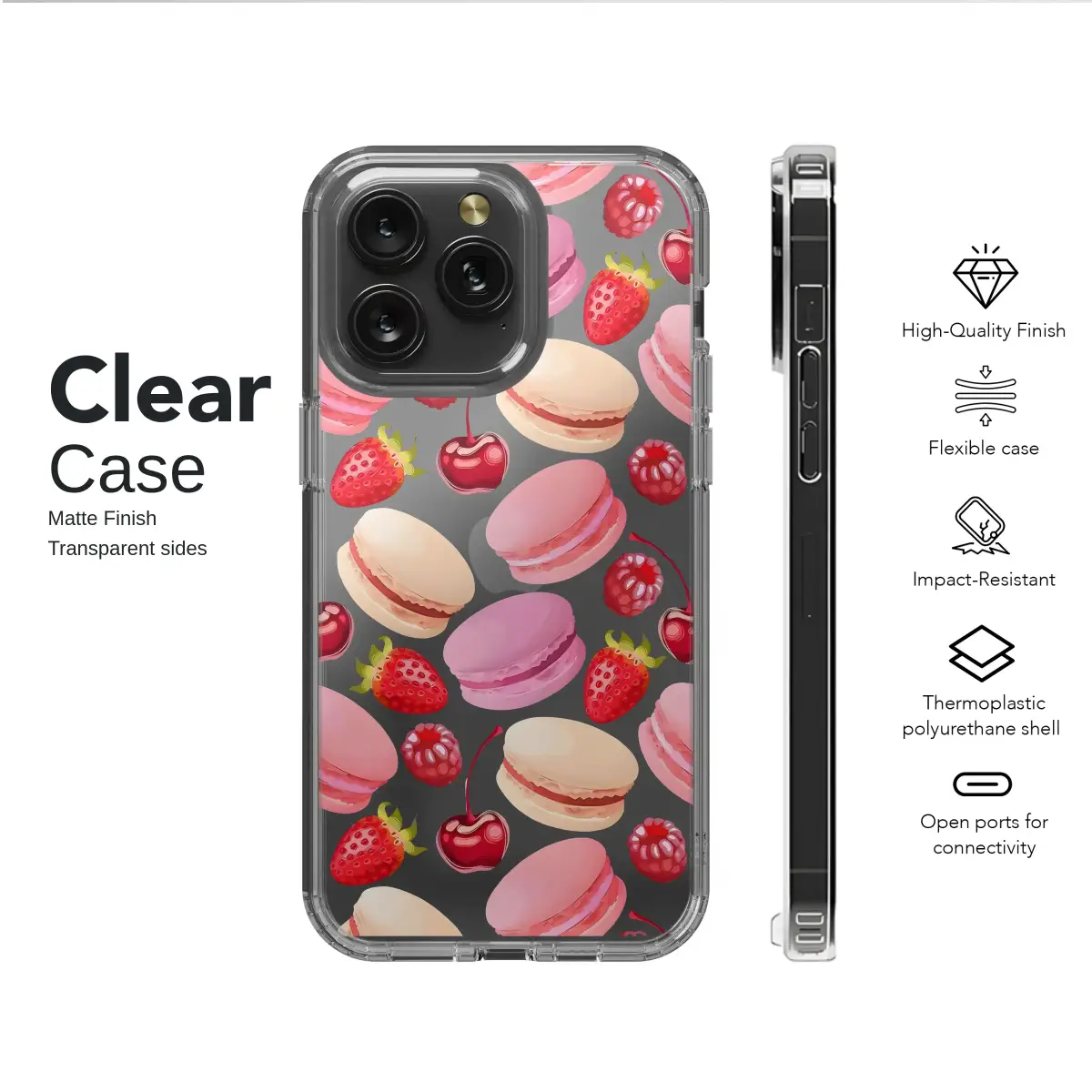 Indulge in a sweet digital dream with this vibrant macaron and berry design. This delightful pattern features an array of delicious pink and cream macarons, juicy red strawberries, plump raspberries, and sweet cherries. A unique pixelated glitch effect adds a modern, artistic twist to the classic foodie aesthetic, creating a fun and eye-catching look.