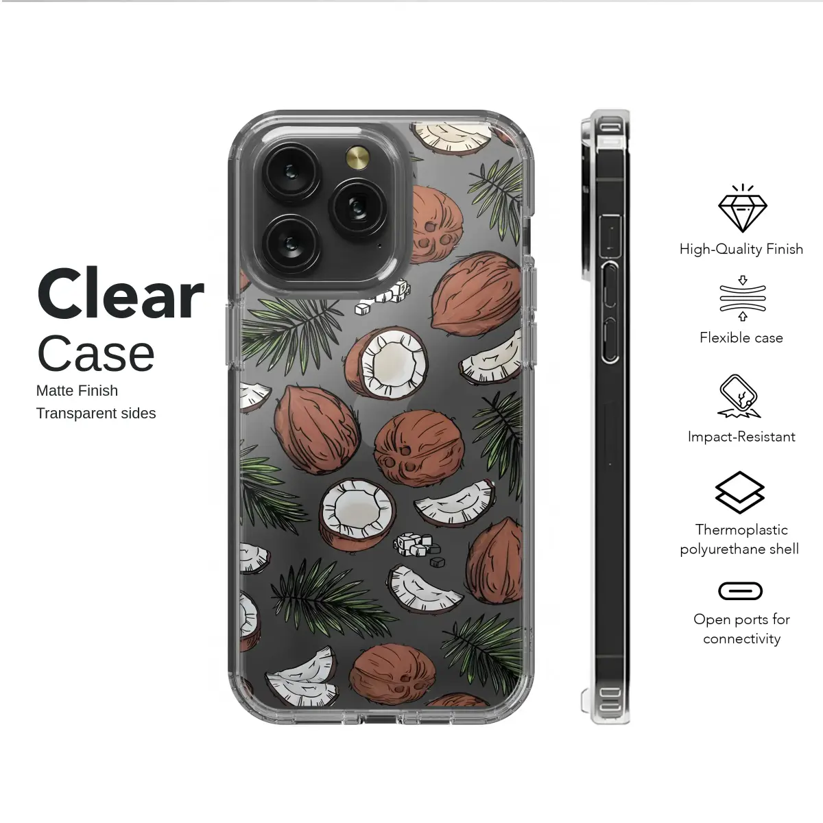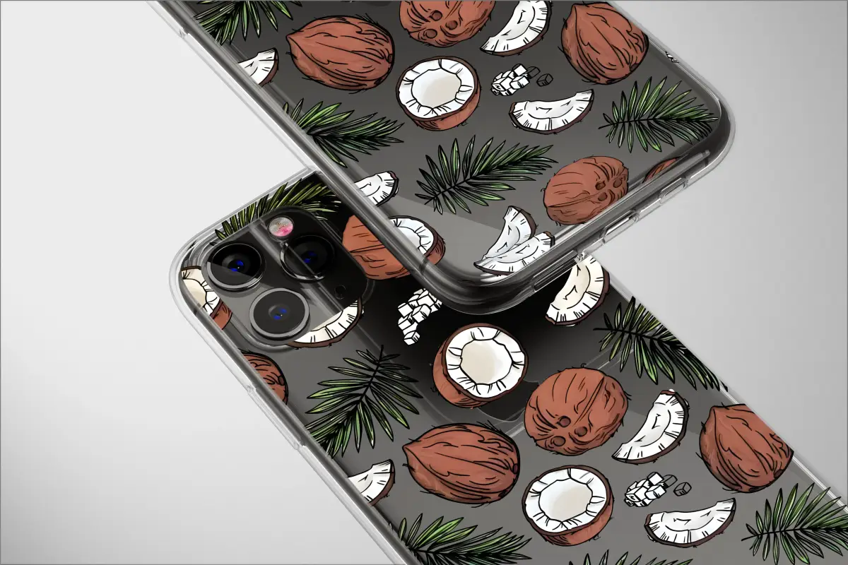 Escape to a tropical paradise with this vibrant coconut and palm leaf design. Featuring a lively illustrated pattern of whole and sliced coconuts scattered amongst lush green palm fronds, this design captures the essence of summer. The bold black background makes the natural brown and green colors stand out, creating a striking and stylish look.