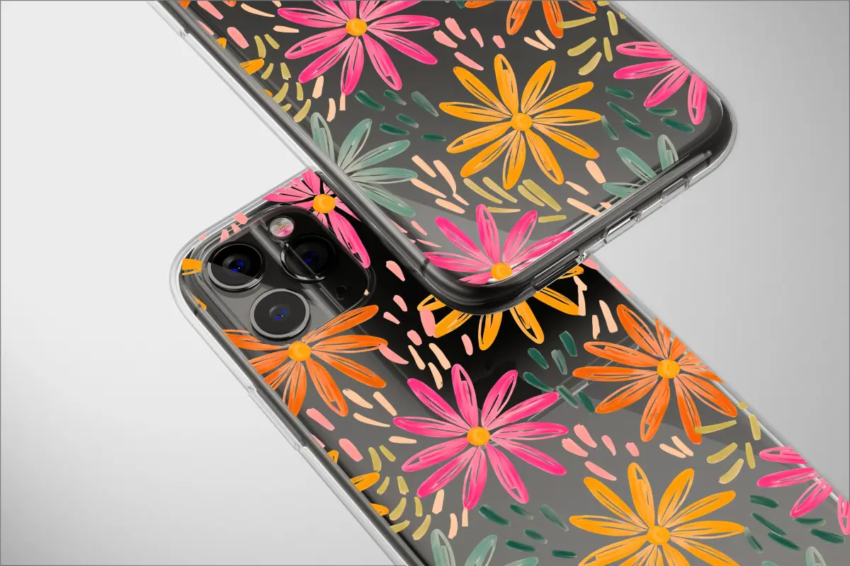 Embrace a burst of digital nature with this unique floral design. Featuring brightly colored daisies in vibrant shades of pink, orange, and teal, this pattern stands out against a playful, pixelated background. The painterly style and abstract glitch effect create a modern, artistic aesthetic that is both cheerful and chic, perfect for showcasing a love for bold botanicals and contemporary art.