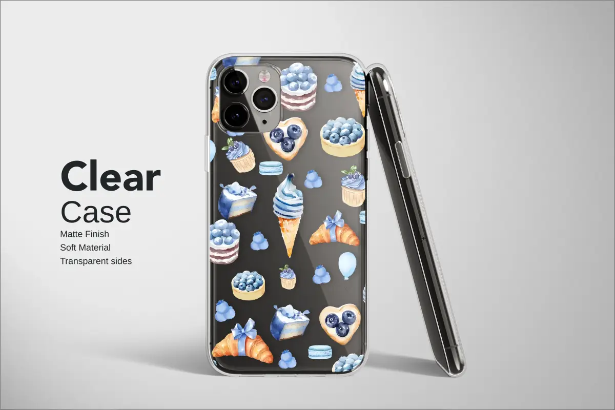 Showcase your love for sweet treats with this charming watercolor design. The pattern features a delightful assortment of blueberry-themed pastries like cakes, cupcakes, and ice cream cones, all rendered in a whimsical, hand-painted style. The soft blue tones against warm pastry colors create an appetizing and cute aesthetic, perfect for any foodie or dessert lover.