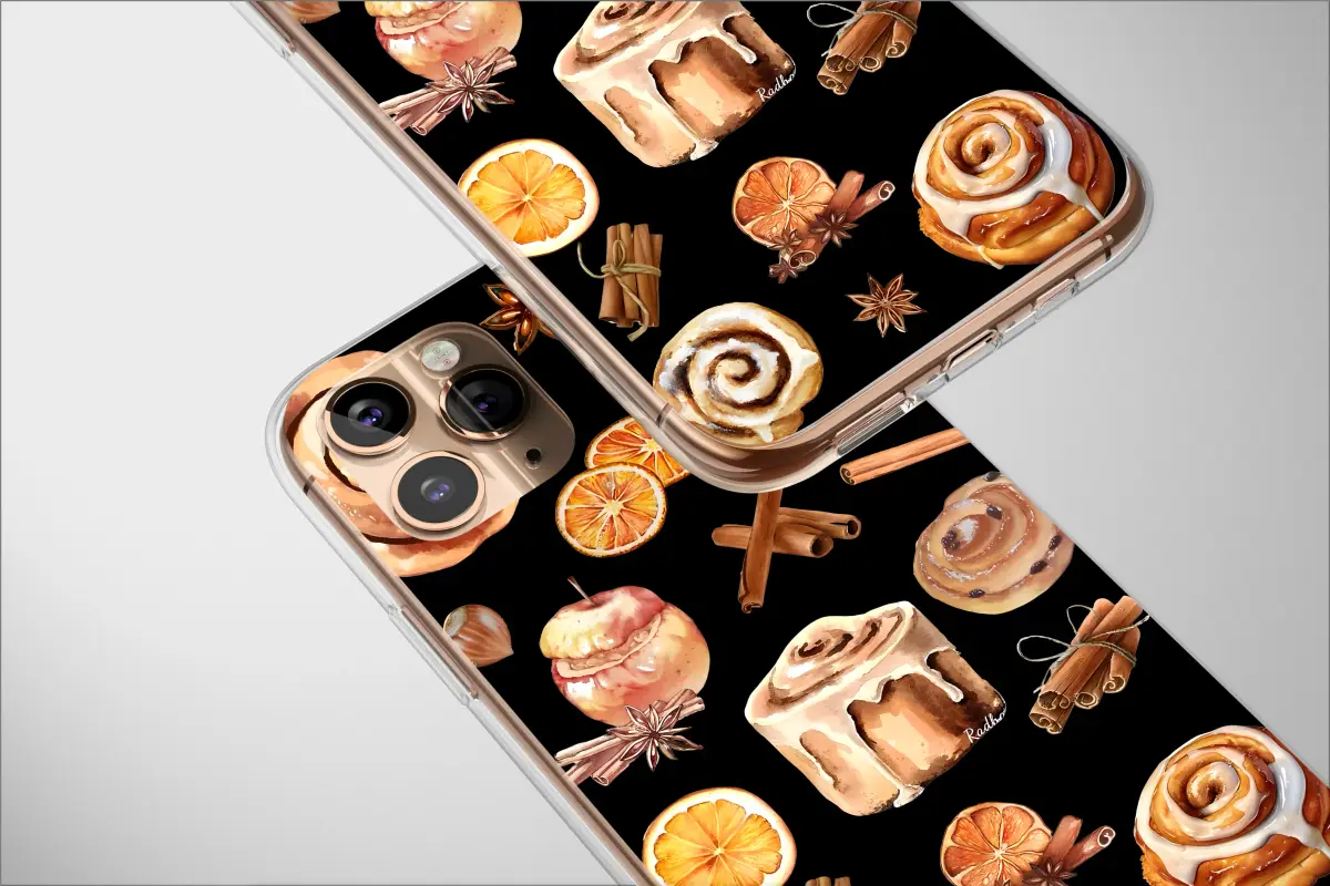 Embrace the warmth of the autumn season with this delightful watercolor design. The pattern features an array of cozy treats and spices, including freshly baked cinnamon rolls with icing, fragrant cinnamon sticks, star anise, and dried orange slices. This charming illustration captures the comforting essence of a fall bakery, perfect for anyone who loves sweet treats and baking.