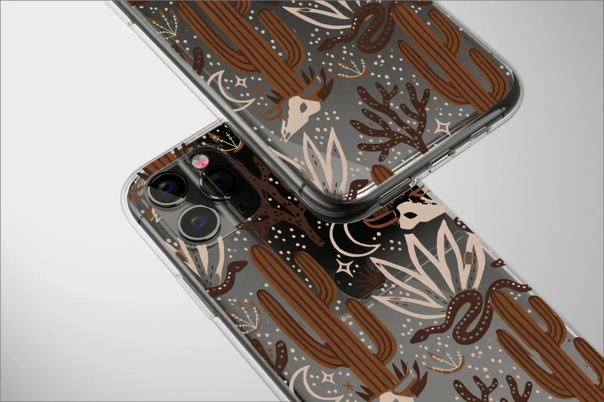Capture the spirit of the Southwest with this intricate desert-themed design. The pattern features a detailed illustration of saguaro cacti, cow skulls, winding snakes, and agave plants. Set against a subtle, earthy-toned background with celestial moon and star accents, this design evokes a rustic, bohemian, and mystical vibe perfect for lovers of western aesthetics.