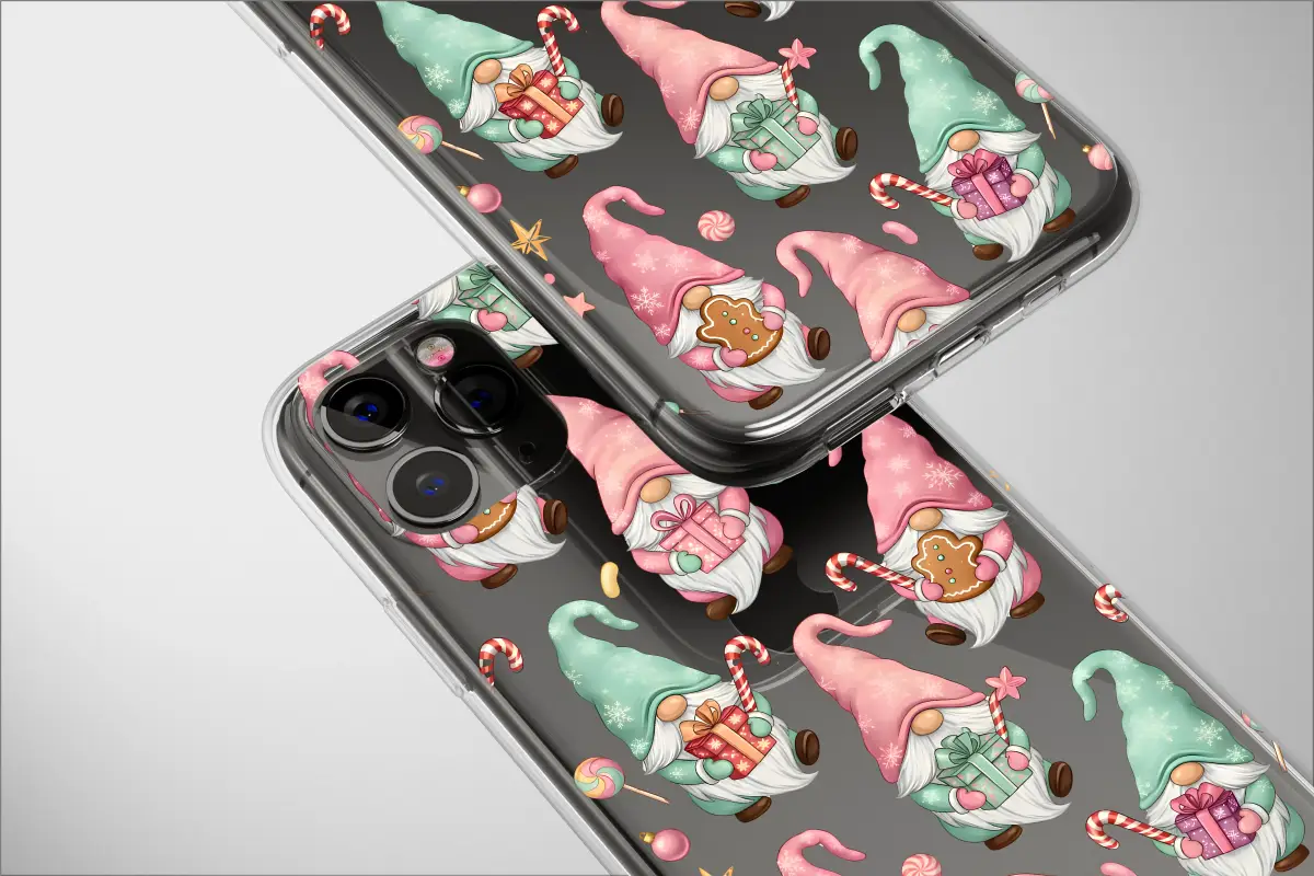 Embrace the festive season with this charming Christmas gnome design. The whimsical pattern features adorable gnomes in soft pastel pink and teal, each holding a holiday treat like a gingerbread man, candy cane, or a festive gift. Delicate snowflakes and sweet candies are scattered throughout, creating a magical and cheerful holiday look perfect for winter.
