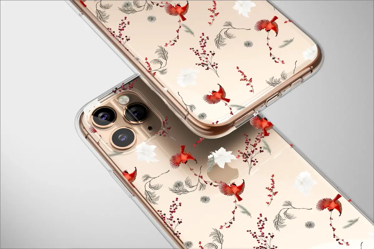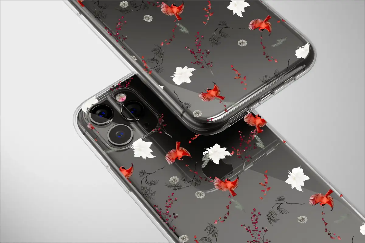 Embrace the beauty of the winter season with this elegant pattern. Featuring vibrant red cardinals in flight amidst festive red berries, snowy pinecones, and delicate white blossoms, all set against a striking black backdrop. This nature-inspired design captures a classic, festive woodland scene perfect for the holiday season.