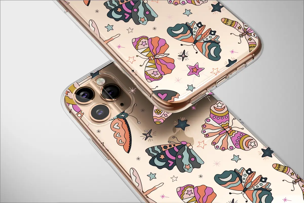Let your spirit take flight on a velvet midnight breeze, where a whimsical kaleidoscope of celestial butterflies and groovy moths dance among shimmering stars. This dreamy design is a love letter to the 70s, capturing a magical, free-spirited vibe with its retro color palette of dusty rose, warm mustard, cool teal, and soft peach set against a deep black sky. Each winged wonder is a miniature tapestry of boho charm, adorned with tiny hearts, cosmic symbols, and hippie-inspired patterns that whisper of nostalgia and wonder. Transform your most essential daily accessory into a personal totem, a piece of wearable art that protects your connection to the world while expressing your unique soul. It’s the perfect artistic shield for the modern mystic, a unique statement piece that wraps your tech in a dreamy, starry night aesthetic. Whether it's a thoughtful gift for your best friend or a magical treat for yourself, carry this little piece of the cosmos with you and let your imagination soar every time it catches your eye. This is more than just a pattern; it’s an entire mood, a small rebellion against the mundane, captured for you to hold.
