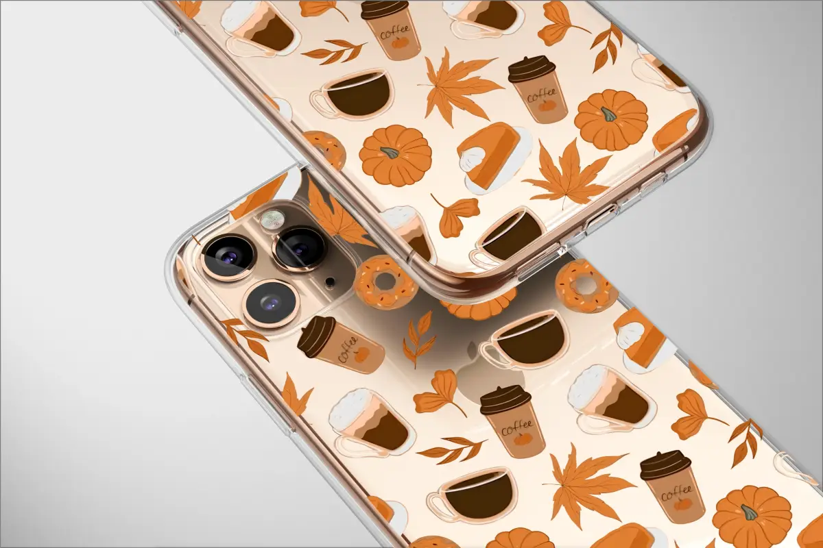 Embrace the coziest season of all with this enchanting autumn-inspired design. Our exclusive pattern captures the heartwarming essence of a perfect fall day, scattered across a classic black canvas. Imagine crisp, golden leaves tumbling alongside plump, cheerful pumpkins and delicious slices of pumpkin pie topped with a dollop of cream. Steaming mugs of latte and to-go coffee cups promise warmth and comfort, while sweet frosted donuts add a touch of playful delight. This illustrated celebration of all things autumn is perfect for anyone who loves the scent of cinnamon, the comfort of a warm drink, and the magic of sweater weather. The rich palette of burnt orange, warm browns, and creamy whites creates a visually stunning and comforting aesthetic, making it a beautiful accessory for your everyday carry. It's a charming way to celebrate the harvest season, from the first cool breeze of September to the family gatherings of Thanksgiving. Let this delightful artwork bring a touch of seasonal joy to your daily routine or give the perfect thoughtful gift to the fall enthusiast in your life. Carry the spirit of pumpkin spice and everything nice with you, wherever you go.