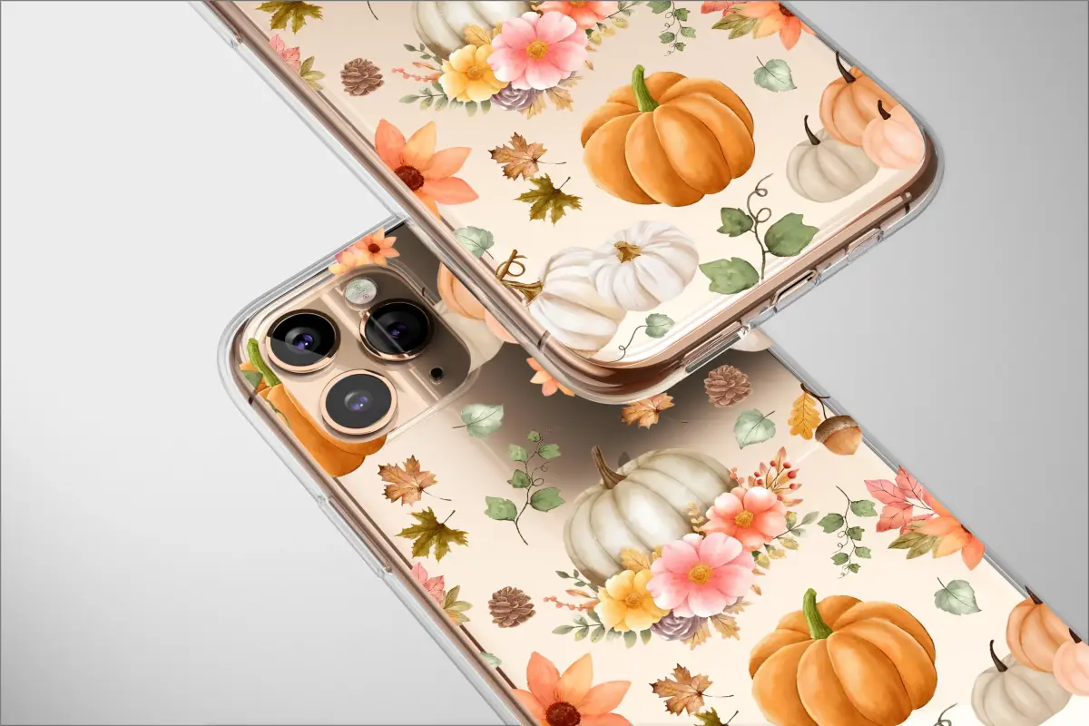Wrap your daily essential in the cozy embrace of autumn with this enchanting watercolor design. Imagine a stroll through a crisp, golden-lit pumpkin patch, captured in a beautiful, artistic pattern. This artwork features a delightful medley of plump orange pumpkins and elegant white gourds, each painted with soft, dreamy textures that feel both rustic and chic. Scattered amongst them are delicate autumn leaves in shades of gold and russet, whimsical acorns, and rustic pinecones, all set against a dramatic black backdrop that makes the warm colors pop. Soft blush and sunny yellow florals add a touch of unexpected sweetness, creating a sophisticated botanical arrangement that celebrates the harvest season. This design is more than just an accessory; it's a piece of art that brings the magic of fall to your fingertips. Perfect for anyone who cherishes pumpkin spice season, cozy cottagecore aesthetics, and the timeless beauty of nature's bounty. Let this charming pattern add a touch of seasonal warmth and artistic flair to your everyday life, a perfect gift for a Thanksgiving host or any lover of autumn.