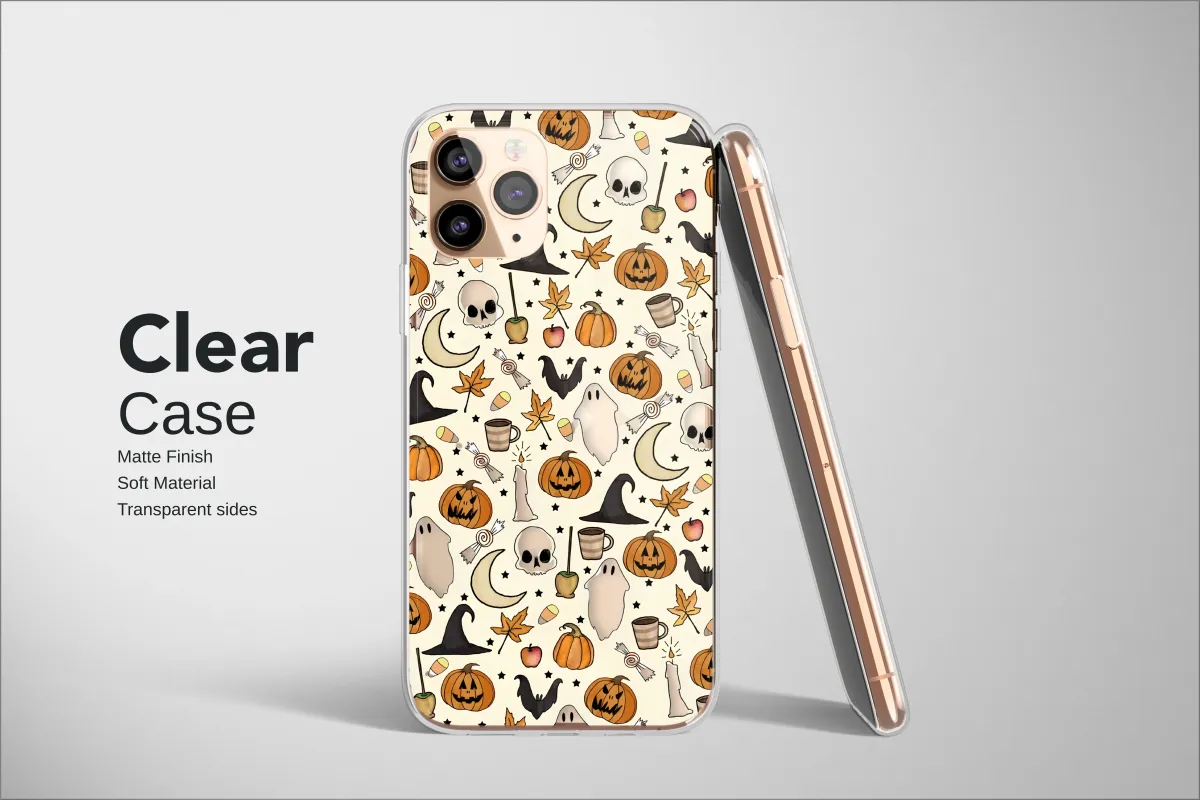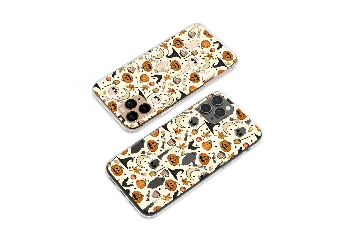 Embrace the enchanting spirit of autumn with this bewitching hand-drawn design, a tapestry of all things cozy and delightfully spooky. Imagine a crisp October evening, where grinning jack-o'-lanterns flicker beside melting candles, and friendly ghosts drift between crescent moons and twinkling stars. This whimsical pattern captures the heart of spooky season, featuring everything from pointed witch hats and flying bats to sweet candy corn and delicious caramel apples waiting to be devoured. The warm, inviting illustration brings to life the comforting nostalgia of fall, with steaming mugs of cider and golden autumn leaves scattered amongst mischievous skulls and magical sweets. It's a perfect celebration of Halloween night, blending a touch of eerie charm with the heartwarming feel of your favorite seasonal traditions. Let this captivating artwork adorn your favorite accessory, adding a sprinkle of cottagecore magic and handmade artistry to your everyday carry. It's an ideal way to carry the magic of the harvest festival with you, a constant reminder of crackling fires, sweet treats, and the whimsical spookiness that makes this time of year so special. This unique illustration is a perfect gift for any lover of fall, vintage Halloween aesthetics, or anyone who wishes it could be October all year long.