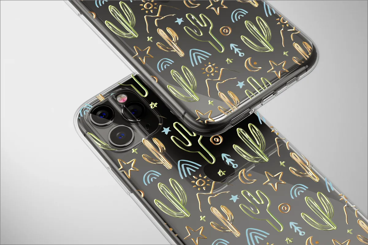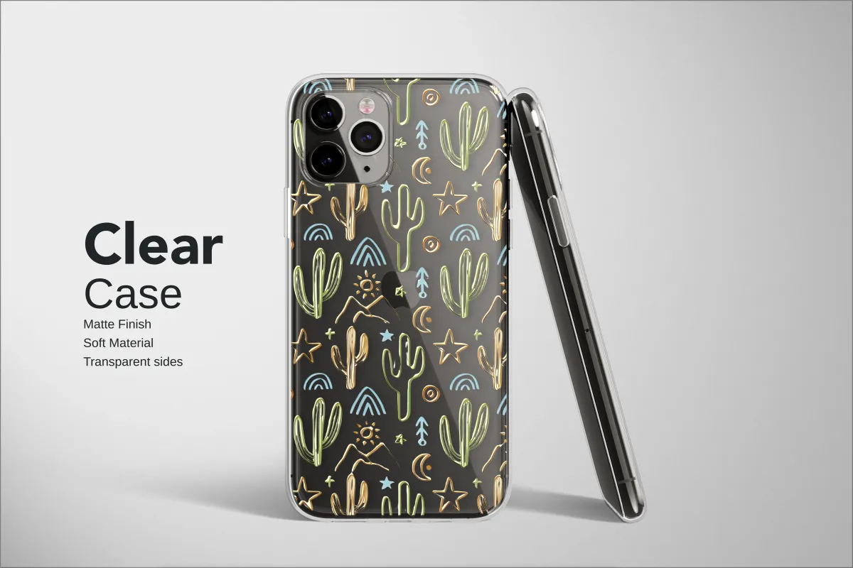 Capture the enchanting spirit of a desert night with this captivating, hand-drawn design, a perfect artistic expression for your most-used accessory. Imagine yourself under a boundless celestial sky, where whimsical saguaro cacti stand tall against a backdrop of distant mountains, glowing crescent moons, and twinkling stars. This intricate pattern effortlessly blends earthy, southwestern charm with a touch of mystical, bohemian energy, creating a visual story of adventure and serene wonder. Each element, from the radiant suns to the delicate rainbows and celestial symbols, is crafted to evoke a profound sense of wanderlust and a deep connection to the wild, open spaces that call to the soul. The unique, embossed-style linework in earthy green, warm gold, and cool blue against a deep black canvas makes the artwork pop with dimension and character. It’s more than just a pattern; it’s a talisman for the free-spirited, a small piece of art for the stargazer, and a daily reminder for the dreamer. Let this mystic landscape protect your essential gear, transforming it from a simple tool into a statement of who you are. This design makes an ideal, thoughtful gift for anyone who cherishes nature, travel, and a dash of cosmic magic in their life.