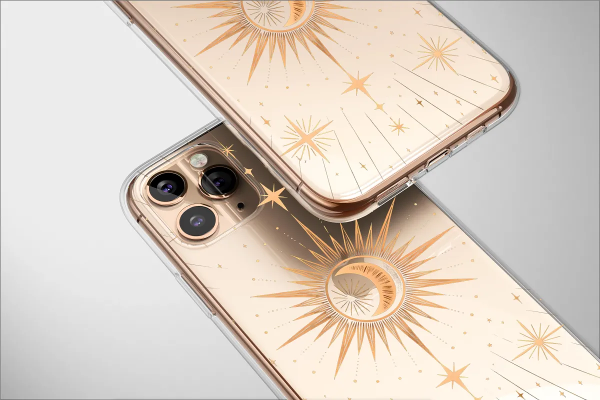 Immerse yourself in a universe where ancient cosmology spectacularly collides with the digital age. This captivating artwork presents a radiant golden sun, its intricate rays reaching across the void, tenderly holding a serene crescent moon within its core—a timeless symbol of balance, duality, and cosmic unity. This celestial dance is set against a fractured reality, a deep black canvas interrupted by streams of glitched data, like a star chart seen through a corrupted signal. Shimmering constellations and a distant crescent scatter across this digital firmament, their classic beauty beautifully distorted by horizontal waves of earthy gold, warm bronze, and deep umber. This design speaks to the modern mystic, the dreamer who finds magic in both ancient tarot symbolism and the hum of technology. It captures the powerful energy of a solar eclipse viewed through a futuristic lens, making it a perfect statement piece for anyone who navigates life with an old soul and a digital heart. Adorn your most essential item with this enigmatic charm, a daily reminder of your own unique, multifaceted universe and the beautiful, complex harmony found within chaos. It’s an ideal gift for lovers of astrology, spiritual art, and all things witchy and wonderful.
