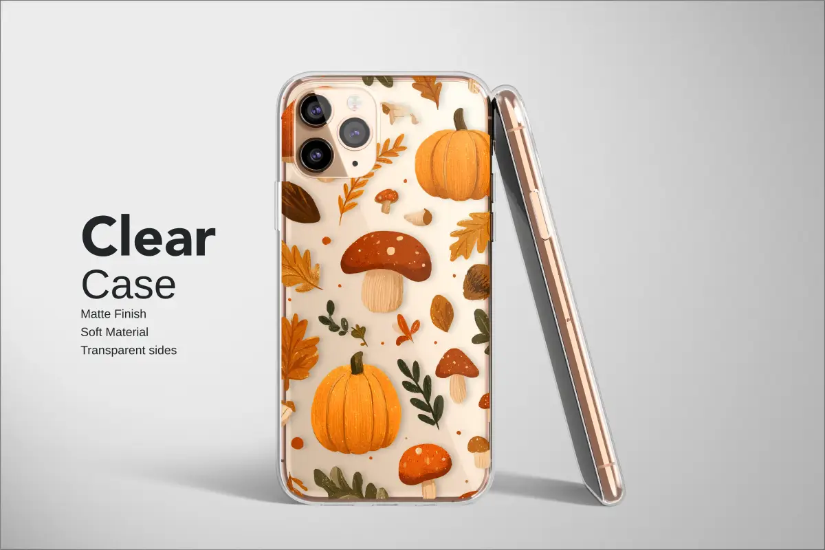 Step into an enchanted woodland as twilight falls with this captivating autumn design. Imagine a quiet stroll through a moonlit forest, where the air is crisp and the ground is a tapestry of nature's treasures. This beautiful pattern brings that feeling to life, showcasing a delightful harvest of plump, textured pumpkins, whimsical spotted toadstools, and a scatter of delicate autumn leaves. Each element is rendered with a charming, rustic texture, evoking the cozy feeling of a warm sweater and a crackling fire. The rich, earthy tones of burnt orange, deep russet, and forest green stand out beautifully against a deep black background, making the design both moody and wonderfully inviting. Perfect for anyone who adores the fall season, this botanical illustration captures the magical essence of autumn. It's an ideal accessory for lovers of cottagecore charm, dark academia aesthetics, and the whimsical world of goblincore. Carry a piece of the serene, enchanted forest with you and celebrate the cozy spirit of the harvest season every day. This design makes a thoughtful gift for nature enthusiasts, mushroom foragers, and anyone who finds beauty in the rustic elegance of the woods.