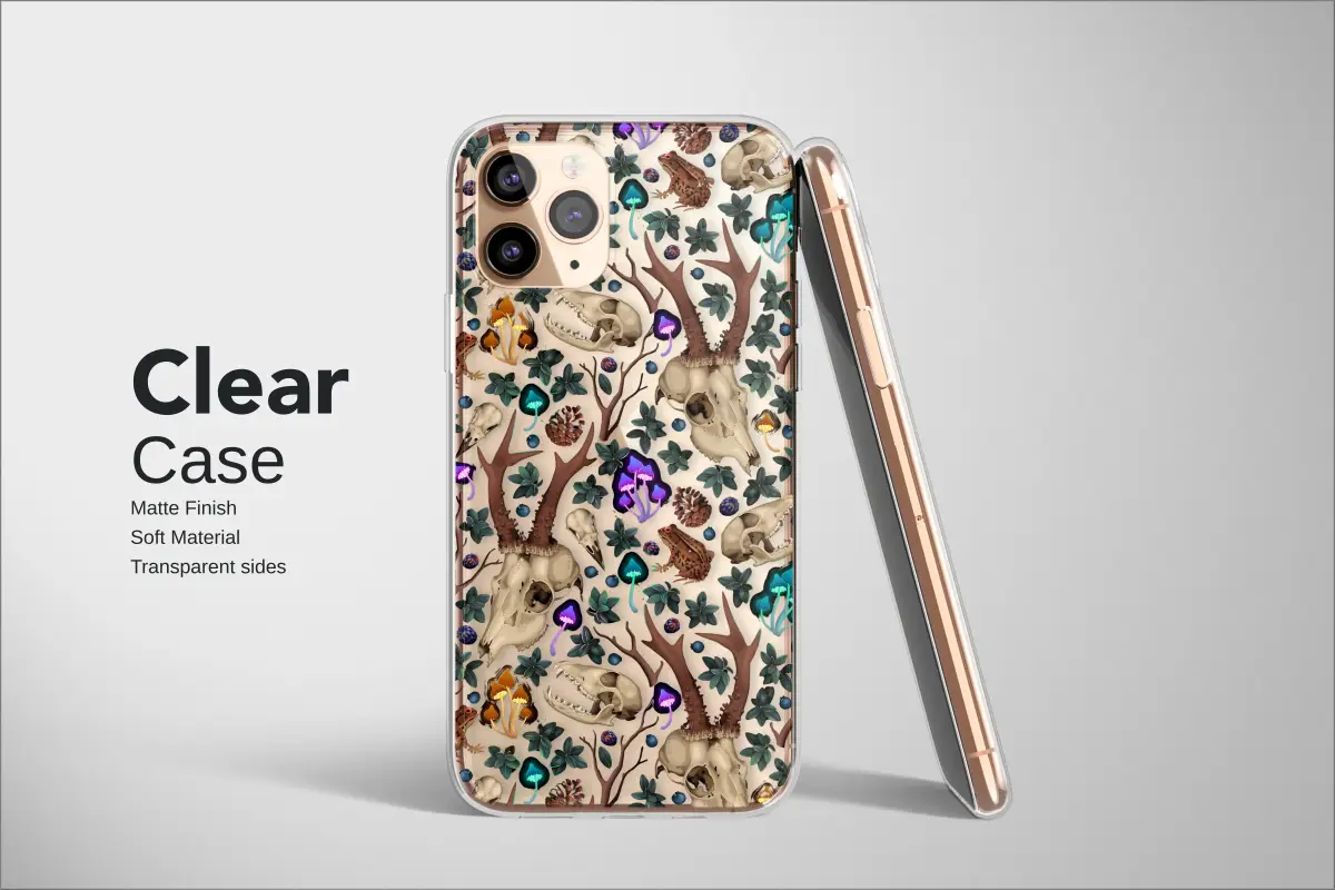 Venture deep into an enchanted forest long after dusk with this captivating design, a mystical tapestry woven from the secrets of the woodland floor. Here, life and decay dance in a delicate, eternal balance under a blanket of stars. Weathered deer, fox, and bird skulls rest amongst lush foliage, tangled branches, and fallen pinecones, each a relic telling a silent tale of seasons past. Curious, spotted toads peek from behind dark leaves, their watchful eyes reflecting the hidden marvels of their domain. The true magic of this nocturnal world awakens in the shadows, where clusters of fantastical mushrooms cast a vibrant, bioluminescent glow, illuminating the darkness with otherworldly shades of neon blue, ethereal purple, and warm amber. This intricate, moody pattern is a perfect treasure for the devoted lover of goblincore charm, the haunting beauty of cottagegore, and the witchy allure of the natural world. Let this stunning piece of dark naturalism wrap your most essential accessory in the profound, quiet magic of the forest, a constant, tangible reminder of the hidden wonders that thrive just beyond the veil.
