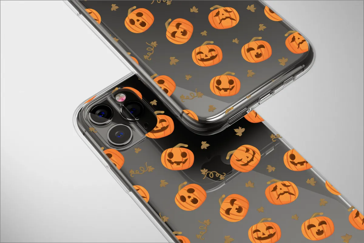 Step into the heart of autumn with a design that captures the playful spirit of a moonlit pumpkin patch. Against a deep black canvas, a delightful troupe of jack-o'-lanterns comes to life, each carved with its own unique personality. You'll find cheerful grins, spooky scowls, surprised gasps, and mischievous winks scattered throughout this whimsical pattern. Tiny autumn leaves and curling vines drift between the glowing orange faces, adding a touch of rustic harvest magic to the scene. This artwork is a celebration of crisp air, crunchy leaves, and the enchanting thrill of Halloween night. It's perfect for anyone who adores the spooky season and wants to carry a piece of its joyful, mysterious energy with them. Let this charming pattern be your personal ode to all things fall, a vibrant and fun accessory that brings the magic of trick-or-treating and spooky stories to your everyday style, keeping the festive spirit alive all year round.