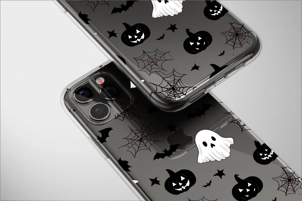 Embrace the enchanting chill of the spooky season with a design that's more sweet than scary. Dive into a midnight world where friendly little ghosts drift playfully through the inky darkness, their cheerful 'boos' echoing silently among grinning jack-o'-lanterns. Each pumpkin's mischievous smile glows softly from the shadows, creating a delightful All Hallows' Eve scene. Look closer and discover a world of subtle detail: deep crimson spiderwebs are intricately woven between the silhouettes of tiny bats taking flight against the blackest night. This artwork captures the magical, cozy feeling of crisp autumn evenings and the nostalgic joy of Halloween. It's a perfect blend of cute kawaii charm and a touch of gothic elegance, making it an ideal accessory to celebrate your love for all things fall. Carry this whimsical ghost party with you, letting it add a pop of adorable spookiness to your daily aesthetic. Perfect for anyone who adores the fall season, witchy vibes, or dark academia with a playful twist, this charming ghostly gathering is a wonderful way to showcase your love for the most magical time of the year. Let these little spirits accompany you on all your adventures, bringing a smile to your face every day.