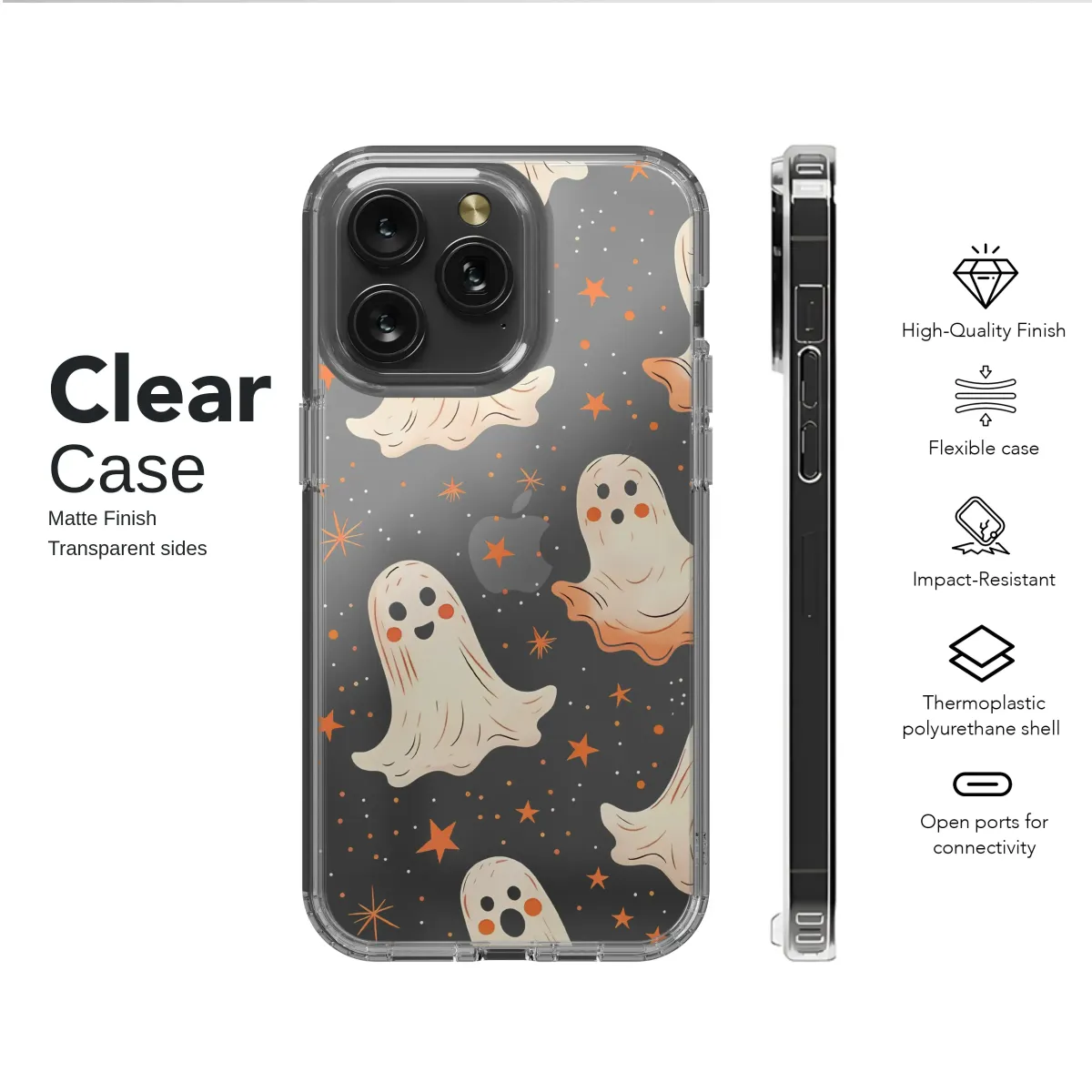 Embrace the magic of the spooky season all year round with a design that's more sweet than scary. Let your personal style shine with this enchanting pattern, where a delightful parade of rosy-cheeked, friendly ghosts float and dance across a deep, pixelated night sky. Each little phantom, with its charmingly simple expression and warm glow, brings a sense of joyful whimsy to the darkness. They glide among a constellation of twinkling orange stars and retro-inspired details, creating a scene reminiscent of a classic, cozy arcade game from a cherished memory. This unique artwork captures the heart of Halloween nostalgia, blending a cute kawaii aesthetic with a touch of vintage charm that feels both fresh and familiar. It’s the perfect way to carry a little bit of autumn enchantment with you, adding a pop of personality and spooky-cute flair to your daily essentials. Let this celestial dance of friendly spirits protect your most-used possession, reminding you that there is magic to be found even in the darkest night. This design isn't just an accessory; it's a conversation starter, a sprinkle of everyday joy, and a perfect gift for anyone who loves the cozier, more charming side of fall. Wrap your tech in a blanket of stars and friendly phantoms and let your spirit soar.