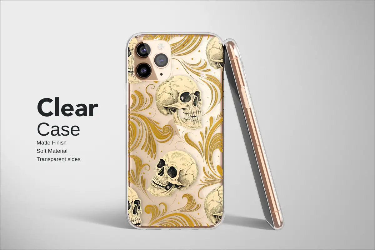 Unveil a world of baroque beauty and whispered secrets with this stunning piece of wearable art, designed to adorn your most essential daily companion. Against a backdrop as deep and dark as a midnight library, intricately detailed skulls float in a timeless dance, their classic, anatomical forms rendered with an artist's delicate touch. They are entwined with lavish swirls of antique gold filigree, their ornate, botanical-like tendrils catching the light with a subtle, luxurious gleam. This is more than just a pattern; it’s a sophisticated memento mori, a nod to gothic romance and the elegant macabre that speaks to the old soul. Perfect for lovers of dark academia, witchy aesthetics, and unique, alternative styles, it transforms your tech into a personal talisman, a protective skin that reflects a deep appreciation for history and mystery. An ideal and thoughtful goth gift or a unique treat for yourself, it’s a statement piece for anyone who finds beauty in the shadows and art in the anatomy of life, ensuring your connection to the world is wrapped in unforgettable style.