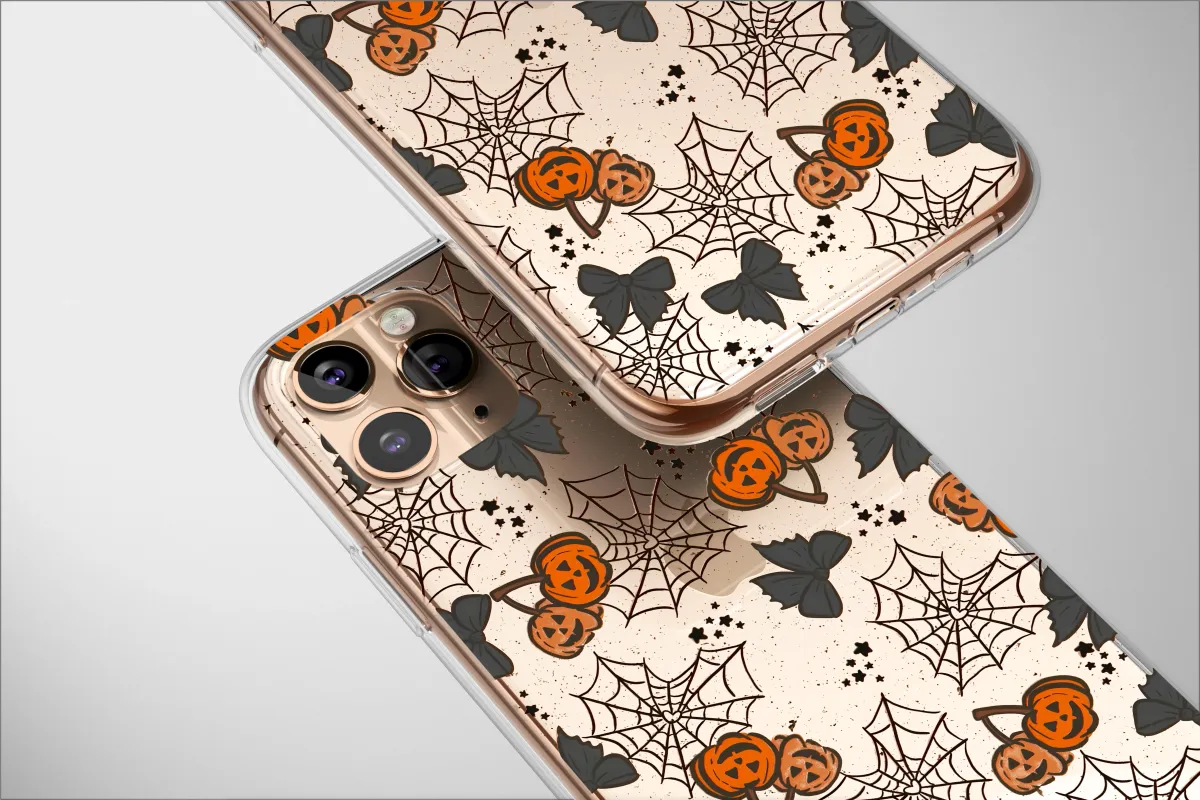 Step into a whimsical world where spooky season meets cottage charm with this enchanting design. Imagine a crisp autumn night, where grinning jack-o'-lanterns peek out from behind intricate spider webs, their cheerful orange glow a warm contrast to the cool, distressed white wood background. Floating amidst this delightful scene are elegant, oversized black bows, adding a touch of gothic sophistication and unexpected sweetness. Tiny black stars are sprinkled throughout, like magical confetti fallen from a midnight sky, enhancing the dreamlike quality of the pattern. This unique artwork captures the playful spirit of Halloween while maintaining a stylish, almost vintage aesthetic, making it the perfect accessory to celebrate the most magical time of the year. Whether you're a lover of all things autumn, adore a cute-spooky vibe, or simply want to carry a piece of Halloween magic with you, this design offers a unique and captivating way to express your seasonal style. It's an ideal statement piece for any fall festival, a charming gift for a fellow Halloween enthusiast, or a daily reminder of the cozy, enchanting spirit of the harvest season.