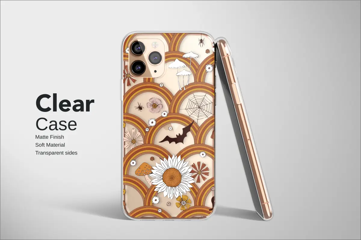 Immerse yourself in a whimsical midnight garden where spooky season perpetually dances with groovy 70s vibes. This enchanting artwork captures a unique, mystical mood, perfect for expressing your inner free spirit. Across a deep black canvas, lush, earthy rainbows arc in a mesmerizing pattern, painted in a warm palette of terracotta, burnt orange, mustard yellow, and deep brown. This retro backdrop sets the stage for a delightful collision of worlds. Hand-drawn daisies, cosmos, and bold sunflowers bloom with a nostalgic charm, scattered amongst curious toadstools and whimsical mushrooms straight from a fairytale forest. But look closer, and you'll find the subtle magic of the night. A silhouetted crow observes from its perch, a lone bat takes flight against the dark, and intricate spiderwebs are spun between the colorful curves. This design is a celebration of beautiful contradictions—the light and the dark, the floral and the mystical, the retro and the contemporary. It's an ideal piece for the modern witch, the bohemian dreamer, or anyone who finds beauty in the unconventional. Adorn your daily essentials with this captivating story, a piece of art that not only protects but also showcases your unique style and love for all things magical and wonderfully weird. It’s a wearable piece of enchantment, a conversation starter that connects you to a world of groovy ghouls and psychedelic dreams.