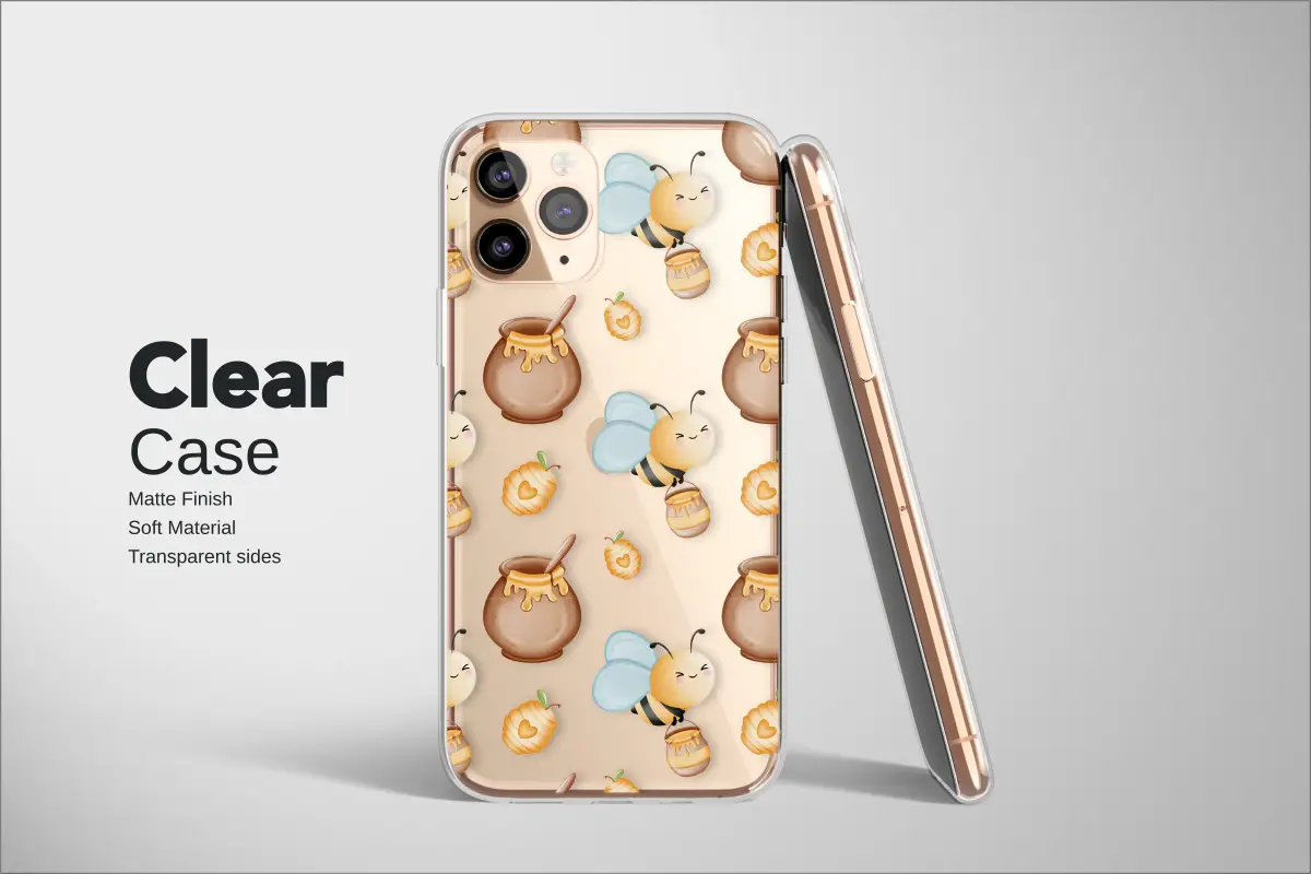 Wrap your daily essential in a whirlwind of pure sweetness and joy with our enchanting Honey Bee design. Imagine chubby, cheerful honey bees, their rosy cheeks beaming with the happiest smiles, buzzing playfully across a dramatic black canvas that makes their golden hues pop. Each tiny bumblebee friend carries a precious pot dripping with golden nectar, fluttering between classic, rustic honey jars and adorable, heart-stamped beehives that look plucked from a fairytale garden. This whimsical scene captures the heart of the cottagecore aesthetic, bringing a warm, storybook feel to your everyday. The hand-drawn, kawaii illustration style offers a joyful escape, a little reminder to 'bee happy' every time you glance down. It's the perfect nature lover gift, a beautiful piece of art that adds a personal touch and a dash of cheerful charm to your most important accessory. Let this sweet illustration be the charming companion that makes your tech uniquely yours, spreading a little bit of sunshine and cottagecore magic wherever you go. This happy bee design is more than just a pattern; it’s a pocketful of happiness to carry with you.