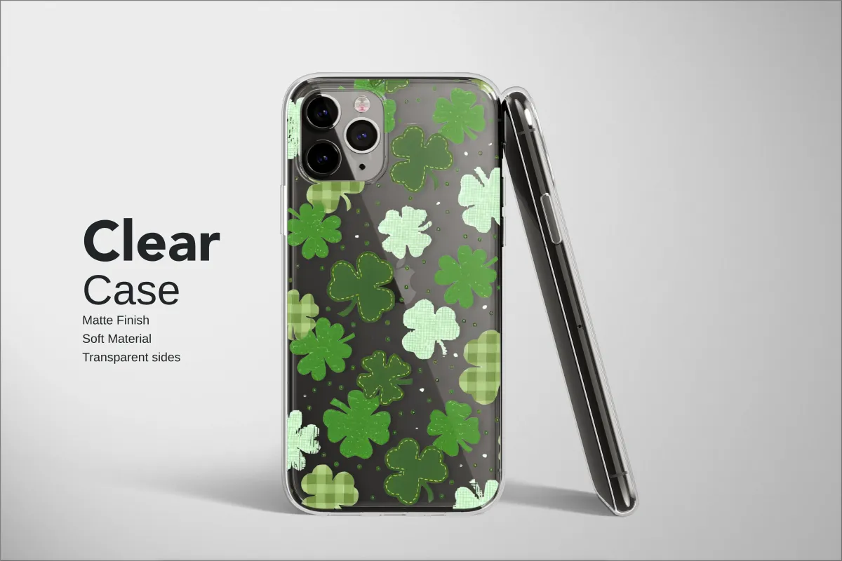 Wrap your daily essentials in a field of pure fortune with this enchanting shamrock pattern, designed to bring a touch of luck and handcrafted charm to every moment. Each four-leaf clover is lovingly rendered with a unique, homespun texture that feels both rustic and modern. You'll find clovers with cozy, stitched edges like a favorite quilt, others in a classic green gingham pattern, and some with the soft texture of felt, all scattered like lucky confetti. Floating against a deep, contrasting black background dotted with tiny green sprites, these symbols of good luck seem to dance with cheerful, celebratory energy. This design captures the heart of cottagecore whimsy and rustic elegance, making it a perfect artistic expression for your most-used accessory. It’s an ideal way to honor your Irish heritage, celebrate the spirit of St. Patrick's Day all year round, or simply embrace a vibrant, green aesthetic that brings a smile to your face. Let this beautiful artwork serve as your personal talisman, a constant reminder of hope and good things to come. It makes a thoughtful and unique gift for a friend in need of a little extra luck or a festive treat for yourself, transforming your device into a statement piece of wearable art that's as unique as you are.