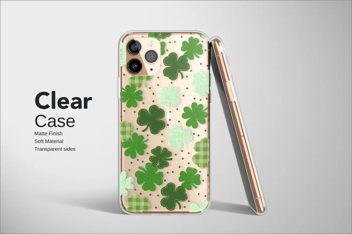 Wrap your daily essentials in a field of pure fortune with this enchanting shamrock pattern, designed to bring a touch of luck and handcrafted charm to every moment. Each four-leaf clover is lovingly rendered with a unique, homespun texture that feels both rustic and modern. You'll find clovers with cozy, stitched edges like a favorite quilt, others in a classic green gingham pattern, and some with the soft texture of felt, all scattered like lucky confetti. Floating against a deep, contrasting black background dotted with tiny green sprites, these symbols of good luck seem to dance with cheerful, celebratory energy. This design captures the heart of cottagecore whimsy and rustic elegance, making it a perfect artistic expression for your most-used accessory. It’s an ideal way to honor your Irish heritage, celebrate the spirit of St. Patrick's Day all year round, or simply embrace a vibrant, green aesthetic that brings a smile to your face. Let this beautiful artwork serve as your personal talisman, a constant reminder of hope and good things to come. It makes a thoughtful and unique gift for a friend in need of a little extra luck or a festive treat for yourself, transforming your device into a statement piece of wearable art that's as unique as you are.
