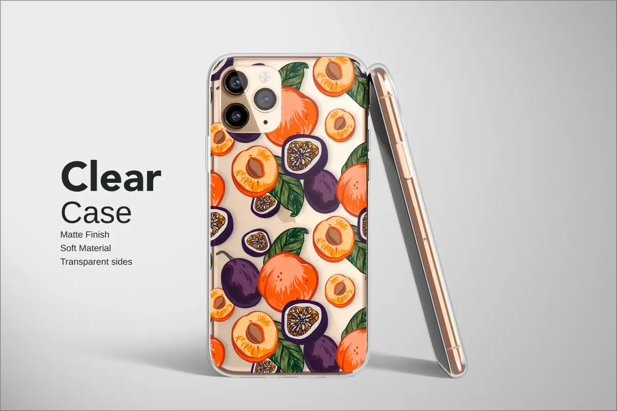 Immerse yourself in the vibrant abundance of a summer harvest with this captivating artwork. Imagine strolling through a sun-drenched orchard, the air filled with the sweet perfume of ripe fruit. This design captures that idyllic moment perfectly, featuring a luscious medley of juicy peaches, deep purple plums, and exotic passion fruits scattered against a dramatic, dark backdrop. The rich, warm oranges of the peaches pop with lifelike detail, their sun-kissed halves revealing a sweet, inviting center. They dance alongside the mysterious, deep violet of whole plums and the intricate, stellar patterns of sliced passion fruit, creating a true feast for the eyes. Every element is rendered in a bold, illustrative style, complemented by lush green leaves that weave through the composition, adding a touch of natural vitality and contrast. This design is more than just a simple pattern; it’s a celebration of nature's bounty, a burst of joyful color destined to brighten your day and add a sophisticated, artistic flair to your most essential accessory. It's the perfect statement piece for the foodie, the art enthusiast, or the nature lover in your life. Carry a piece of endless summer with you, and let this beautiful botanical illustration infuse your daily routine with a touch of organic elegance and vibrant energy.