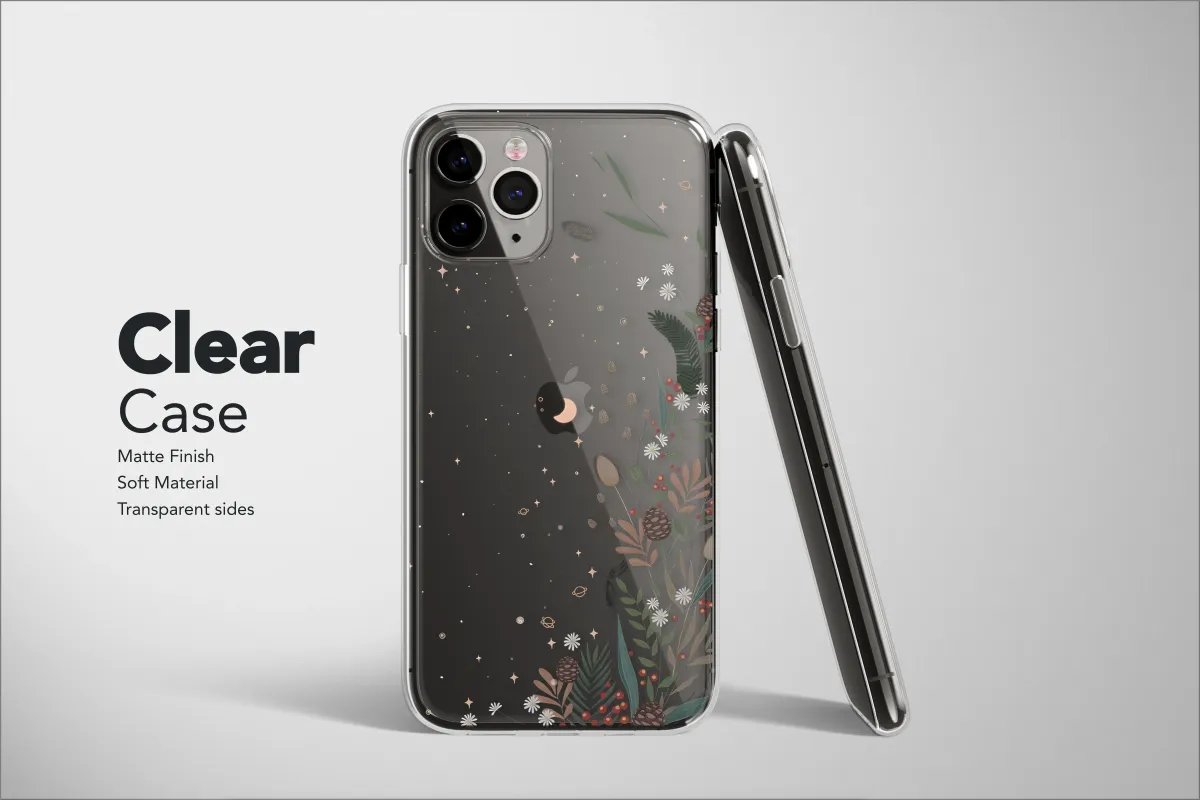 Embrace the magic of a celestial woodland with this enchanting illustrated design, a perfect artistic statement for your most essential device. This captivating artwork captures a moment where earthly botanicals meet the cosmic expanse in a stunning display of nature and night. Against a deep black canvas, a lush arrangement of winter greenery, rustic pine cones, delicate white wildflowers, and vibrant red berries reaches towards a whimsical galaxy. Twinkling rose-gold stars, charming crescent moons, and tiny, ringed planets are scattered throughout the scene, creating a dreamy and ethereal atmosphere. This piece beautifully merges a dark cottagecore charm with a sophisticated, witchy aesthetic, making it a unique adornment for your daily tech. It’s an ideal gift for any stargazer, nature lover, or devotee of bohemian and indie styles. Let this moody floral and celestial design transform your personal accessory into a piece of wearable art, a constant reminder of the quiet wonder found in a forest under a starry night. Carry this pocket-sized piece of the cosmos with you, making a personal statement that is both mystical and beautifully grounded in the natural world. It’s a truly unique way to express your love for all things magical and artistic.