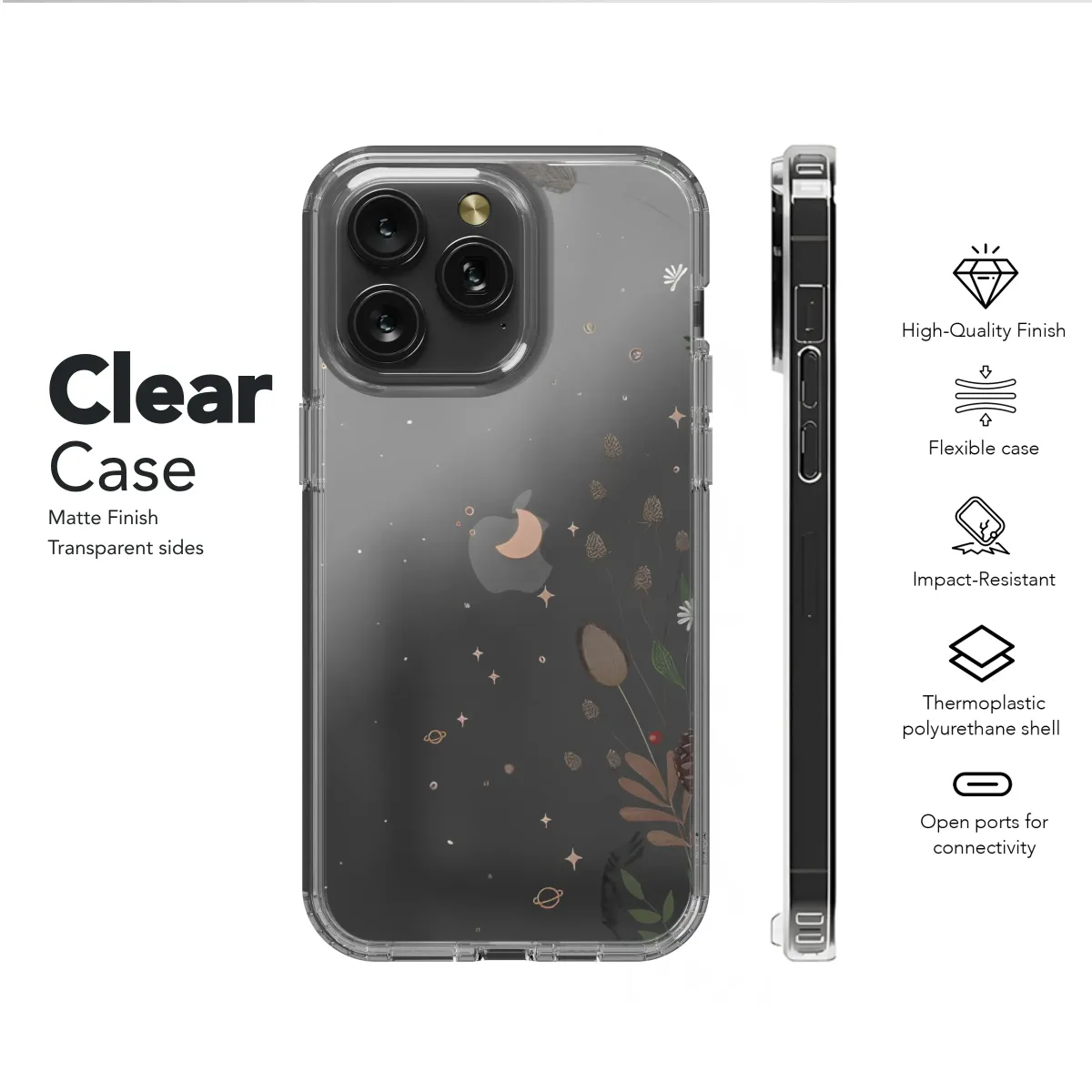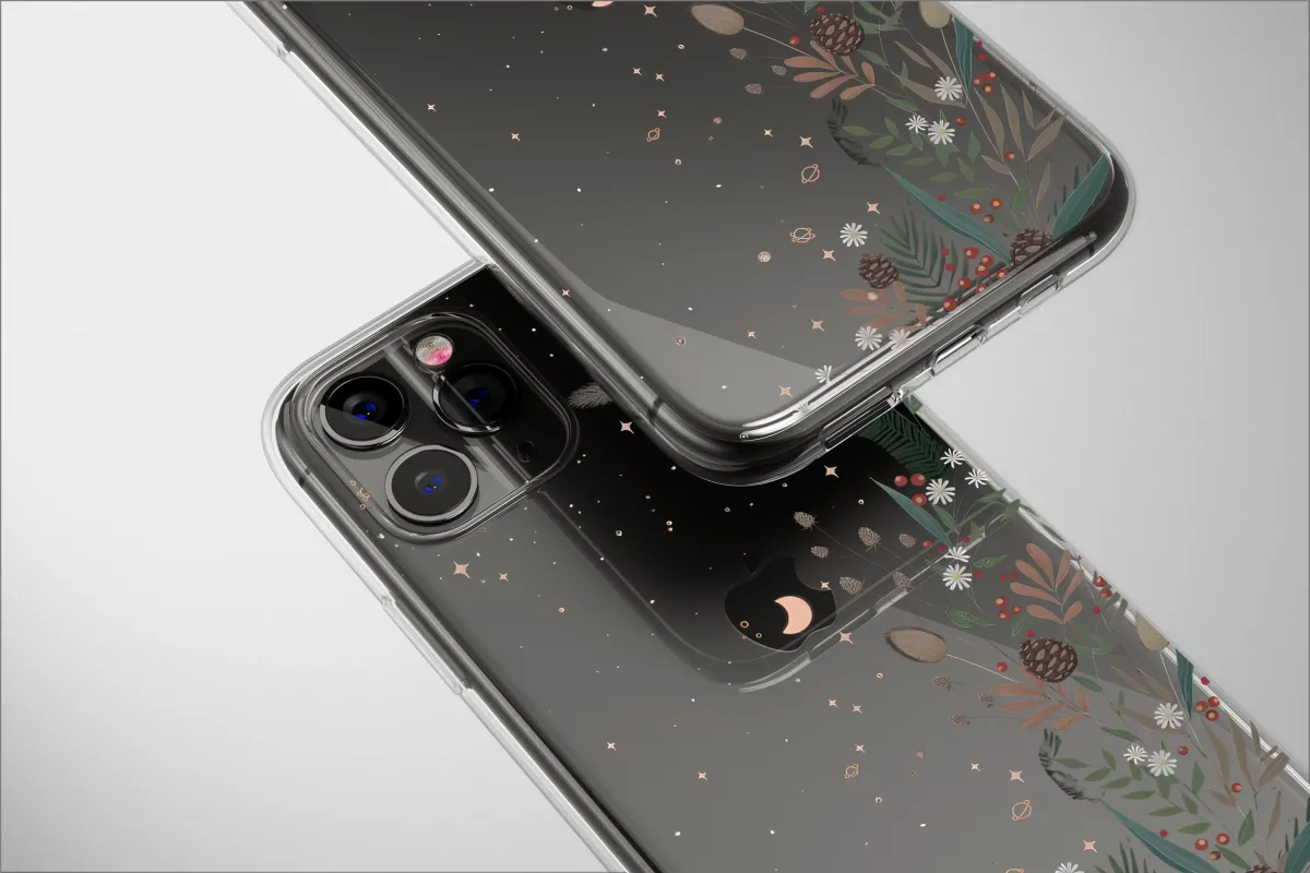 Embrace the magic of a celestial woodland with this enchanting illustrated design, a perfect artistic statement for your most essential device. This captivating artwork captures a moment where earthly botanicals meet the cosmic expanse in a stunning display of nature and night. Against a deep black canvas, a lush arrangement of winter greenery, rustic pine cones, delicate white wildflowers, and vibrant red berries reaches towards a whimsical galaxy. Twinkling rose-gold stars, charming crescent moons, and tiny, ringed planets are scattered throughout the scene, creating a dreamy and ethereal atmosphere. This piece beautifully merges a dark cottagecore charm with a sophisticated, witchy aesthetic, making it a unique adornment for your daily tech. It’s an ideal gift for any stargazer, nature lover, or devotee of bohemian and indie styles. Let this moody floral and celestial design transform your personal accessory into a piece of wearable art, a constant reminder of the quiet wonder found in a forest under a starry night. Carry this pocket-sized piece of the cosmos with you, making a personal statement that is both mystical and beautifully grounded in the natural world. It’s a truly unique way to express your love for all things magical and artistic.