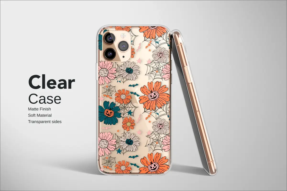 Step into a whimsical midnight garden where spooky season blooms forever. This enchanting design captures the heart of a retro Halloween, blending groovy florals with a touch of charming fright. Imagine a night sky, dark and mysterious, where daisies and cosmos pop in a nostalgic palette of dusty pink, vibrant orange, and deep teal. But look closer—each flower's center holds a grinning jack-o'-lantern, casting a playful glow. Delicate spiderwebs drape between the petals, catching tiny stars, while cute bats flutter through the air, adding to the magical atmosphere. It's a perfect blend of sweet and spooky, a 70s-inspired floral pattern designed for those who love autumn aesthetics and a bit of whimsical fun. This artwork is more than just a pattern; it's a celebration of cozy nights, pumpkin spice, and the delightful thrill of Halloween. Let this unique, hand-drawn illustration wrap your favorite essentials in the spirit of the season, making every day feel a little more magical and delightfully eerie. It's the perfect accessory for the modern witch, the vintage soul, and anyone who believes in the magic of a floral Halloween night.