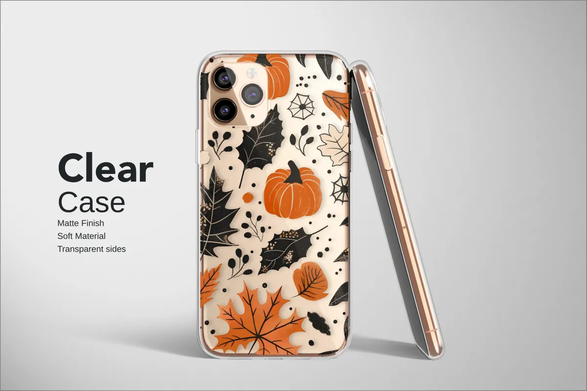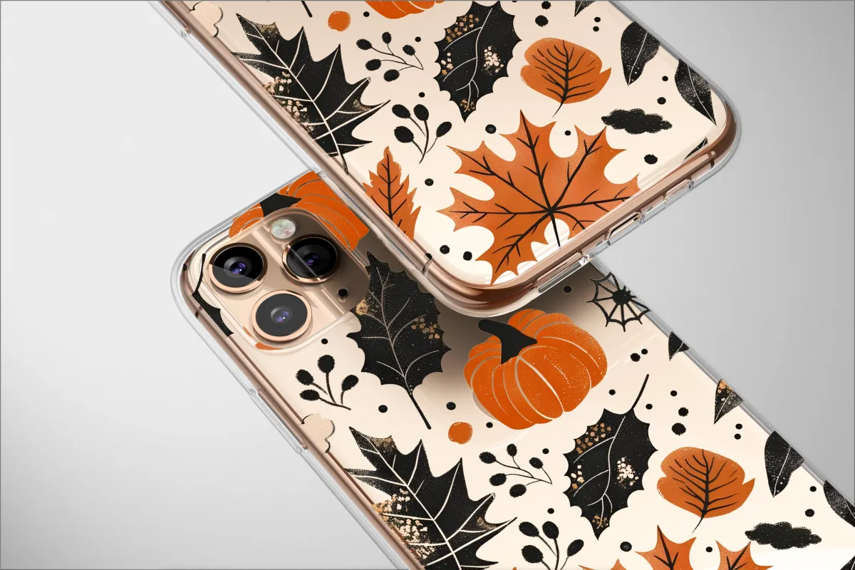 Step into the heart of a bewitching autumn night with this captivating design, a wearable piece of art that perfectly captures the cozy, spooky spirit of the season. Let your imagination wander to a moonlit pumpkin patch, where the air is crisp with the scent of fallen leaves and a touch of magic hangs in the air. Against a deep, inky black canvas, vibrant orange pumpkins glow with a warm, festive light, creating a stunning contrast. A beautiful cascade of fall foliage tumbles around them – rustic maple leaves in burnt sienna, delicate oak leaves in bone-white, and moody, almost gothic black leaves kissed with a subtle golden texture that glimmers like early morning frost. Discover tiny, intricate spider webs and whimsical botanical sprigs that dance between the elements, adding a layer of witchy elegance and dark cottagecore charm to this unique harvest pattern. This design is more than just an accessory; it's an entire autumn aesthetic. It’s the perfect way to carry the feeling of sweater weather, spiced lattes, and golden October afternoons with you everywhere. Let this moody yet charming botanical artwork adorn your daily essentials, wrapping your favorite tech in the timeless, enchanting magic of the fall season. A perfect gift for nature lovers, Halloween enthusiasts, or anyone who wishes it was autumn all year long.