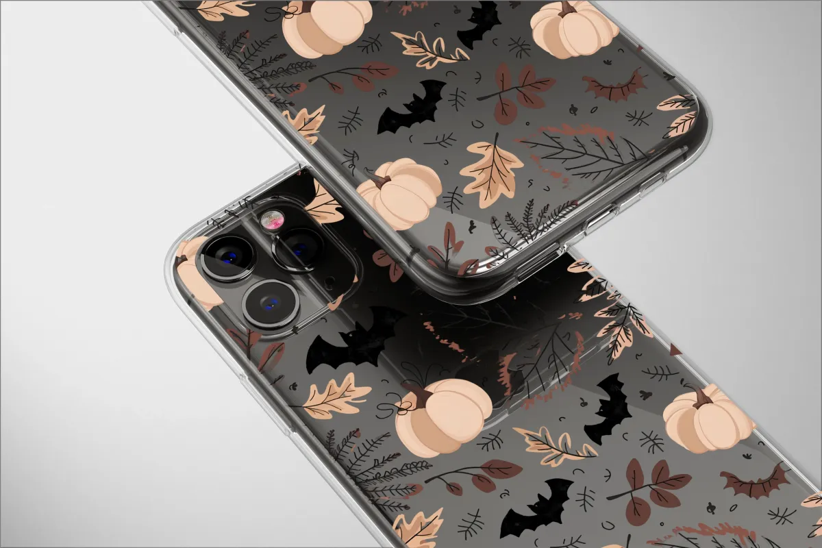 Embrace the enchanting spirit of autumn with this captivating design, capturing the quiet magic of a midnight stroll through a moonlit pumpkin patch. Against a deep, velvety black backdrop, ethereal cream-colored pumpkins nestle among a gentle cascade of falling leaves, creating a stunning visual contrast that is both moody and chic. Each botanical element is rendered in a sophisticated palette of earthy neutrals—rich cocoa, warm taupe, and dusky browns—evoking a sense of rustic warmth and timeless elegance. This isn't just a celebration of harvest; it's a subtle ode to the spooky season, with whimsical bat-shaped leaves fluttering between classic oak and maple silhouettes, adding a touch of elegant goth charm. The design masterfully weaves together the cozy comfort of cottagecore with the moody sophistication of a dark academia aesthetic, making it the perfect artistic statement for your most-used accessory. Imagine the feeling of crisp night air, the scent of fallen leaves, and the soft glow of a distant bonfire, all encapsulated in this beautiful pattern. It’s an essential piece for anyone who lives for sweater weather, finds beauty in nature's quiet moments, and wants to carry a piece of autumnal poetry with them. This unique artwork makes a wonderful gift for her, celebrating the magical transition from fall to Halloween with style.