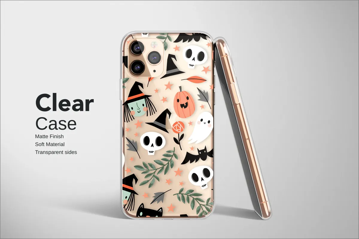 Wrap your world in the enchanting spirit of Halloween with this delightfully spooky and utterly charming artwork. Set against a deep midnight black canvas, a whimsical cast of characters comes to play in a celestial dance of festive fun. Cheerful witches with rosy cheeks and knowing smiles share the starry sky with blushing, friendly ghosts who float gently by. Grinning jack-o'-lanterns radiate a warm, gentle glow, their carved faces full of personality. They're joined by playful, happy skulls, charming black cats with curious eyes, and silhouetted bats that flutter among verdant leaves and a sprinkle of sparkling orange stars. This seamless pattern creates a captivating scene of pure autumnal joy and whimsical fantasy. This isn't just a design; it's a celebration of all things cozy and magical about the fall season. The unique, slightly pixelated art style adds a touch of retro charm, making each character feel like a treasured friend from a classic storybook. Let this captivating illustration bring a sprinkle of hocus pocus to your daily essentials, transforming your favorite accessory into a statement piece that showcases your love for cottagecore horror and kawaii spooky aesthetics. It's the perfect way to carry the heartwarming, whimsical side of Halloween with you, a constant reminder of crisp air and magical, moonlit nights.