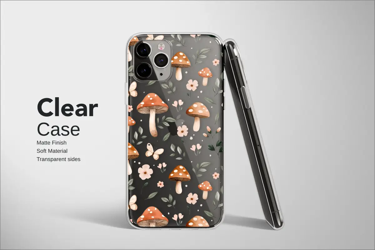 Wander into a secret, moonlit garden with this enchanting design, where the quiet magic of the forest floor comes to life right in your hands. Imagine charming toadstools, their rich, rust-colored caps dotted with creamy spots, sprouting from the mysterious darkness. Delicate butterflies, with wings the color of a soft peach dawn, flutter weightlessly between ethereal, blush-pink blossoms and trailing sprigs of gentle, sage-green foliage. This captivating pattern, set against a dramatic black backdrop, evokes the feeling of a peaceful night in a fairytale woodland, a world both cozy and mystical. Each element possesses a dreamy, watercolor quality, lending a touch of bespoke, hand-painted artistry to your most essential accessory. It’s a perfect piece for the nature lover, the bohemian soul, and anyone who finds beauty in the cottagecore aesthetic. Let this botanical masterpiece transform your daily carry into a canvas of whimsical elegance. It's more than just a pattern; it’s a portal to a tranquil world, a constant reminder of the serene magic hidden within nature. Carry this little piece of an enchanted forest with you and let your imagination bloom every time you see it.