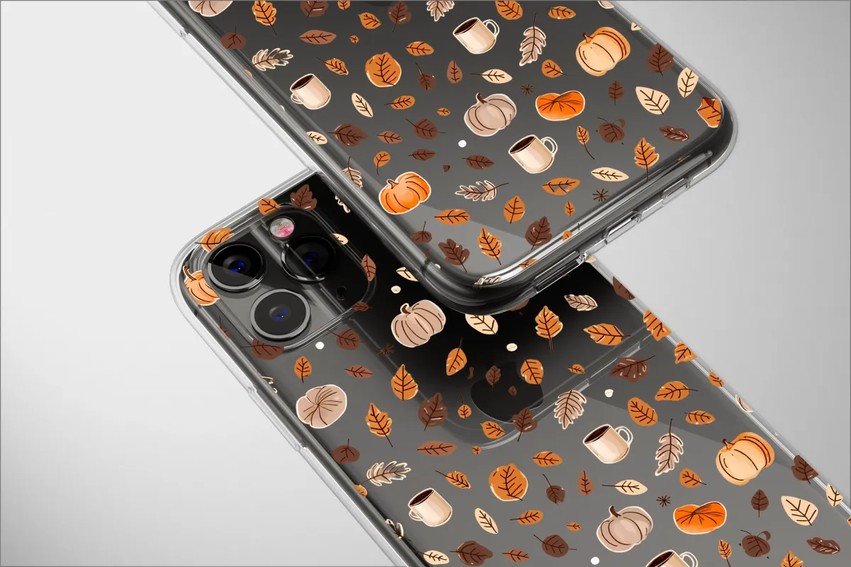 Embrace the enchanting spirit of autumn with this captivating design, capturing the essence of a perfect fall day in a beautiful, repeating pattern. Imagine the crisp October air and the comforting warmth of a spiced latte as you gaze upon this whimsical scene. Against a deep, midnight-black canvas, a delightful dance of seasonal treasures unfolds. Hand-drawn pumpkins in rustic orange and soft cream mingle with a cascade of falling leaves, each painted in rich browns, warm ochres, and gentle tans. Tucked between the foliage are steaming mugs of coffee, promising quiet moments of pure hygge. This artwork is more than just a pattern; it's a mood. It’s for the lover of sweater weather, the seeker of pumpkin patches, and the believer in the magic of spooky season. It’s the perfect touch of autumnal, cottagecore charm to adorn your favorite accessory, a daily reminder of crackling fires and golden afternoons. Let this design bring the cozy, artistic vibe of the harvest season into your everyday life, making every moment feel warm and wonderfully nostalgic.