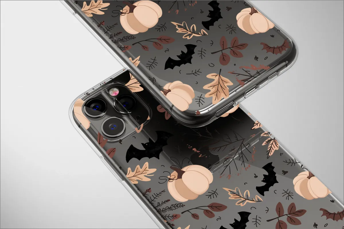 Embrace the enchanting mood of a crisp autumn evening with this captivating artwork. Picture a midnight stroll through a silent harvest field, where soft, cream-colored pumpkins glow against a deep, dark background. A cascade of beautifully illustrated leaves in rich, earthy tones of chocolate brown, warm taupe, and gentle beige dance around them, evoking the feeling of a forest floor under the harvest moon. This design perfectly captures the cozy essence of the fall season—the warmth of a pumpkin spice latte, the comfort of a knit sweater, and the quiet magic that fills the air. With its blend of rustic cottagecore charm and elegant, moody sophistication, this pattern is a tribute to spooky season and all things autumnal. Let this piece of art adorn your favorite accessory, adding a touch of boho, nature-inspired beauty to your everyday life. It's a perfect seasonal gift for the fall lover who eagerly awaits the turning of the leaves and the arrival of pumpkin-everything.