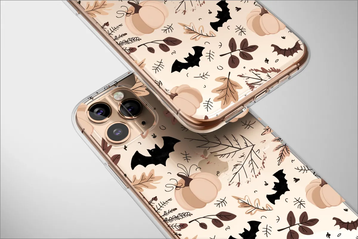 Embrace the enchanting mood of a crisp autumn evening with this captivating artwork. Picture a midnight stroll through a silent harvest field, where soft, cream-colored pumpkins glow against a deep, dark background. A cascade of beautifully illustrated leaves in rich, earthy tones of chocolate brown, warm taupe, and gentle beige dance around them, evoking the feeling of a forest floor under the harvest moon. This design perfectly captures the cozy essence of the fall season—the warmth of a pumpkin spice latte, the comfort of a knit sweater, and the quiet magic that fills the air. With its blend of rustic cottagecore charm and elegant, moody sophistication, this pattern is a tribute to spooky season and all things autumnal. Let this piece of art adorn your favorite accessory, adding a touch of boho, nature-inspired beauty to your everyday life. It's a perfect seasonal gift for the fall lover who eagerly awaits the turning of the leaves and the arrival of pumpkin-everything.